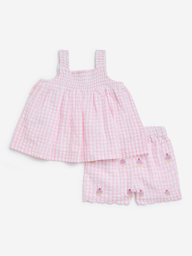 HOP Baby Pink Checkered Cotton Top with Shorts Set