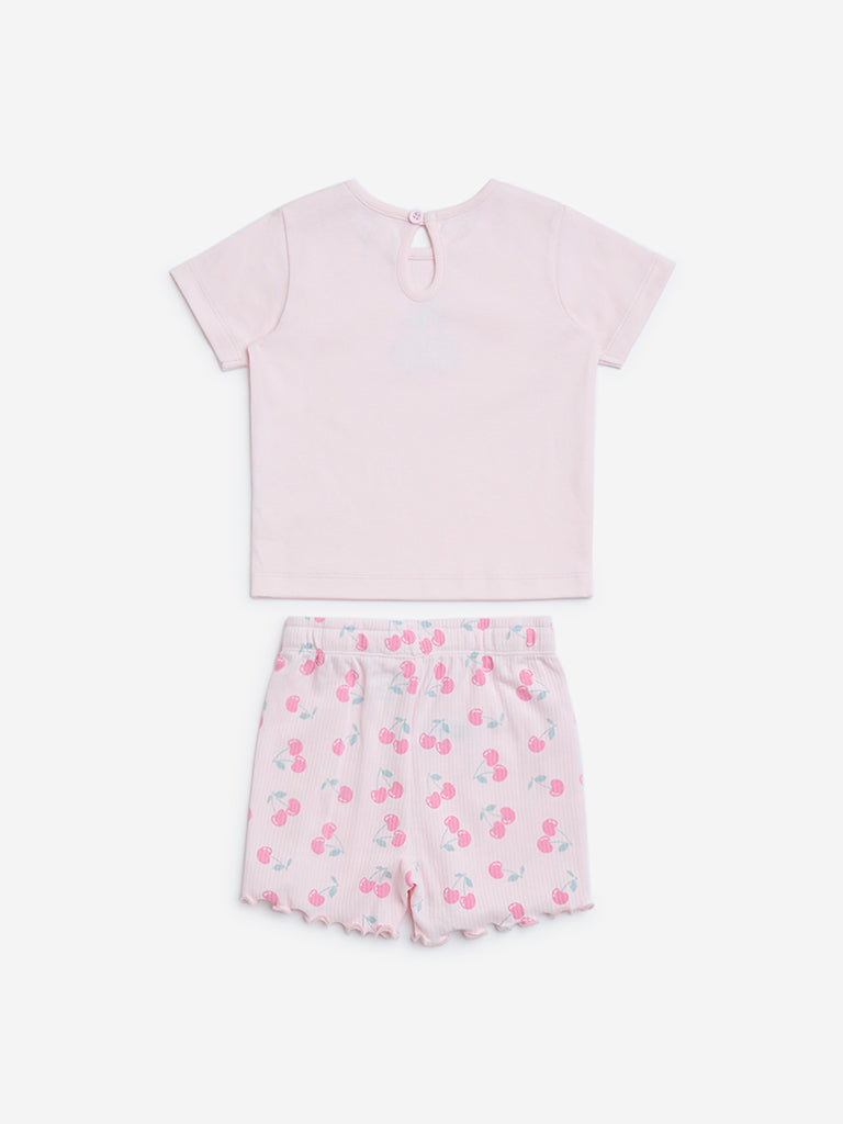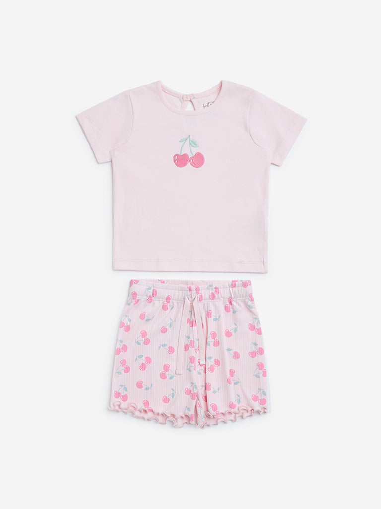 HOP Baby Pink Cherry Printed Cotton T-Shirt and Shorts Set