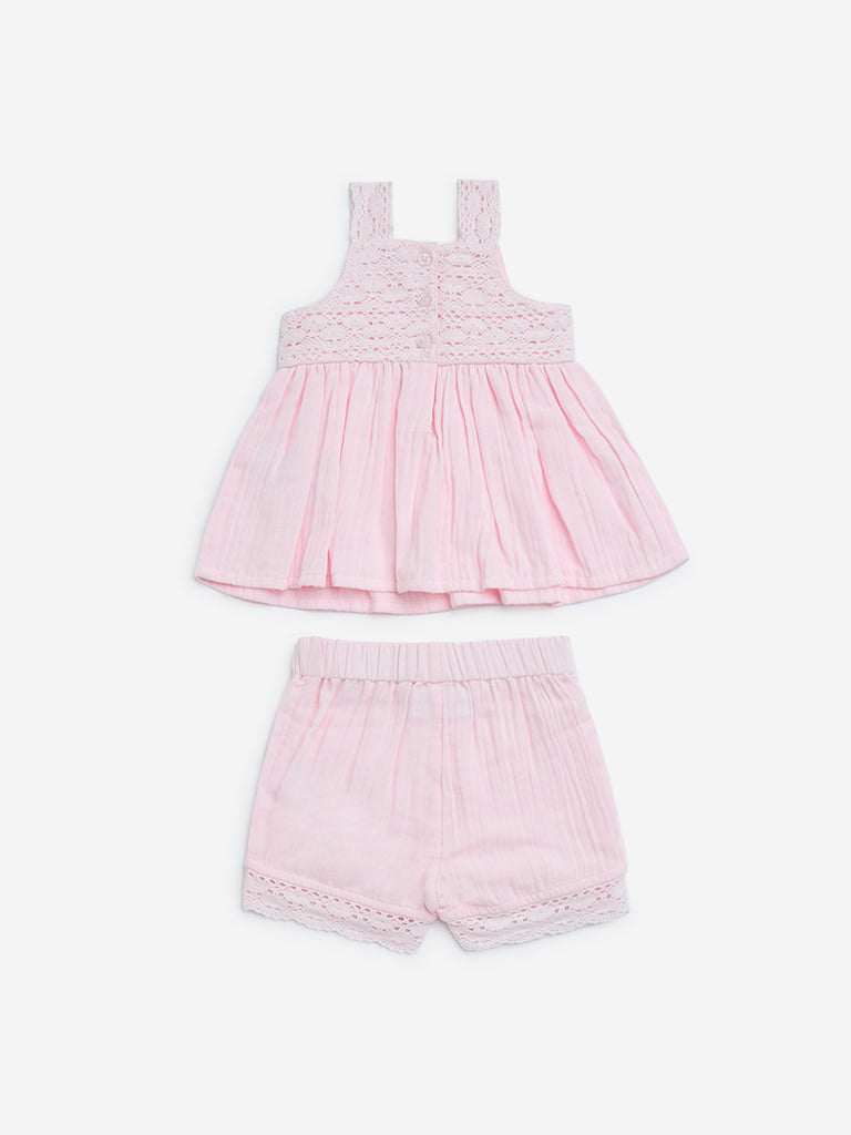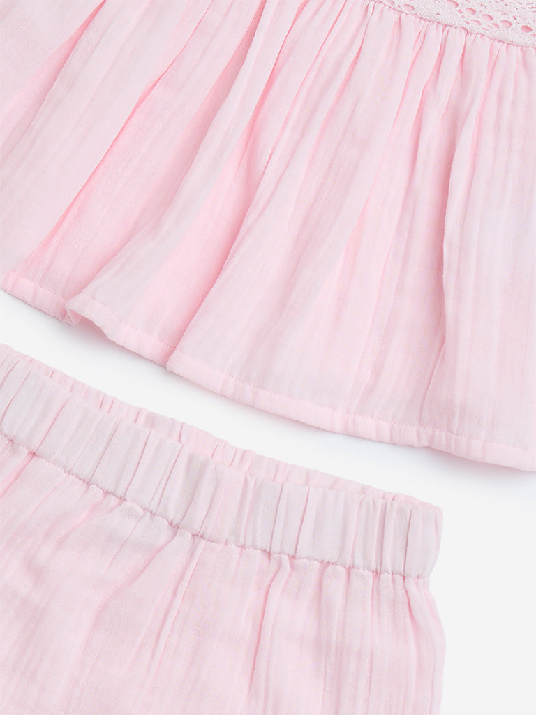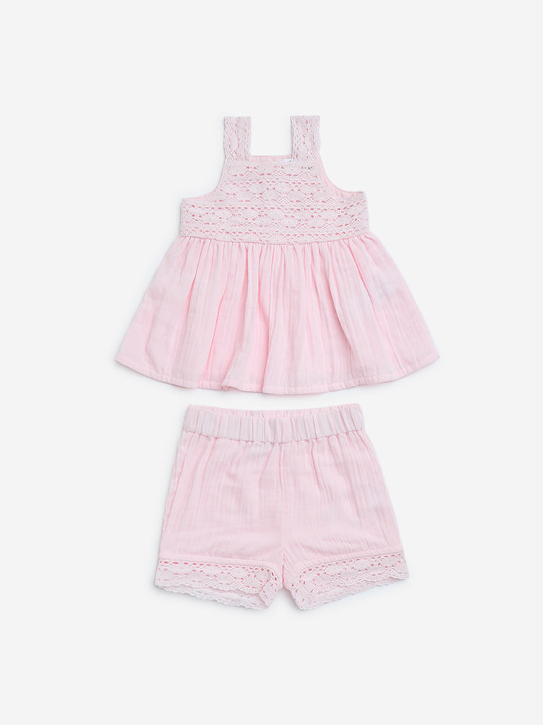 HOP Baby Pink Crochet-Detailed Cotton Top and Shorts Set