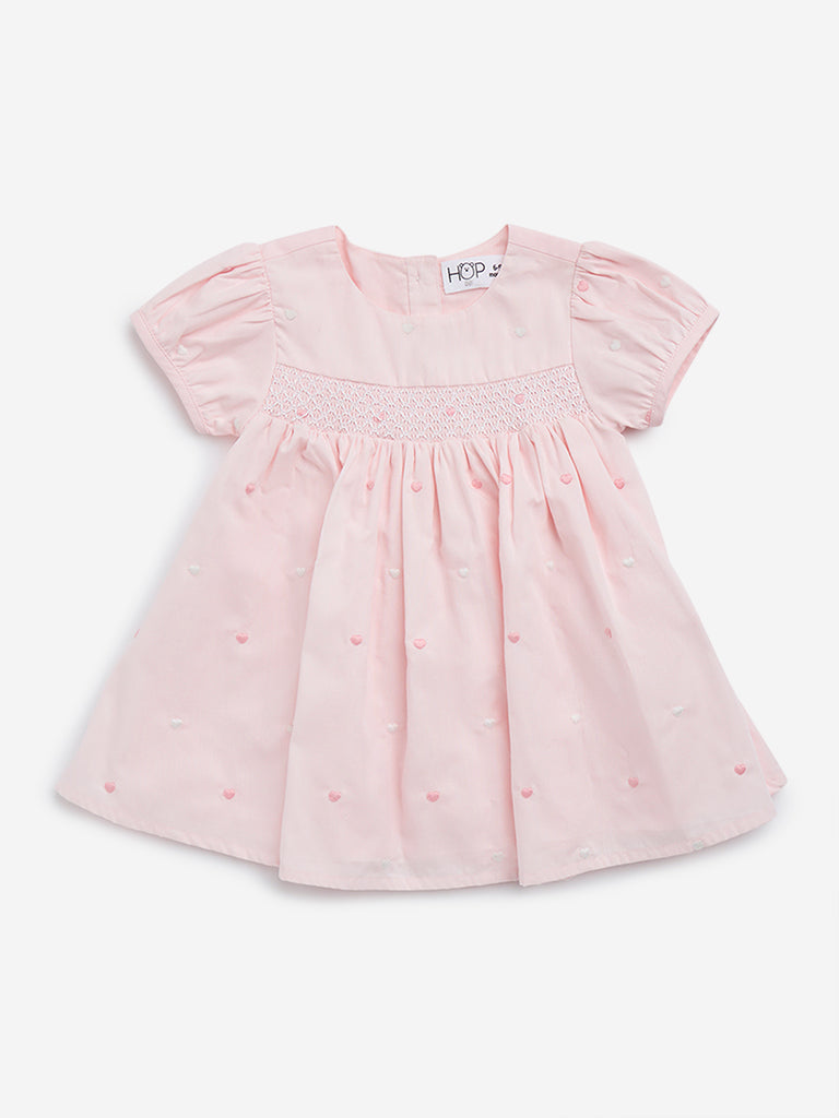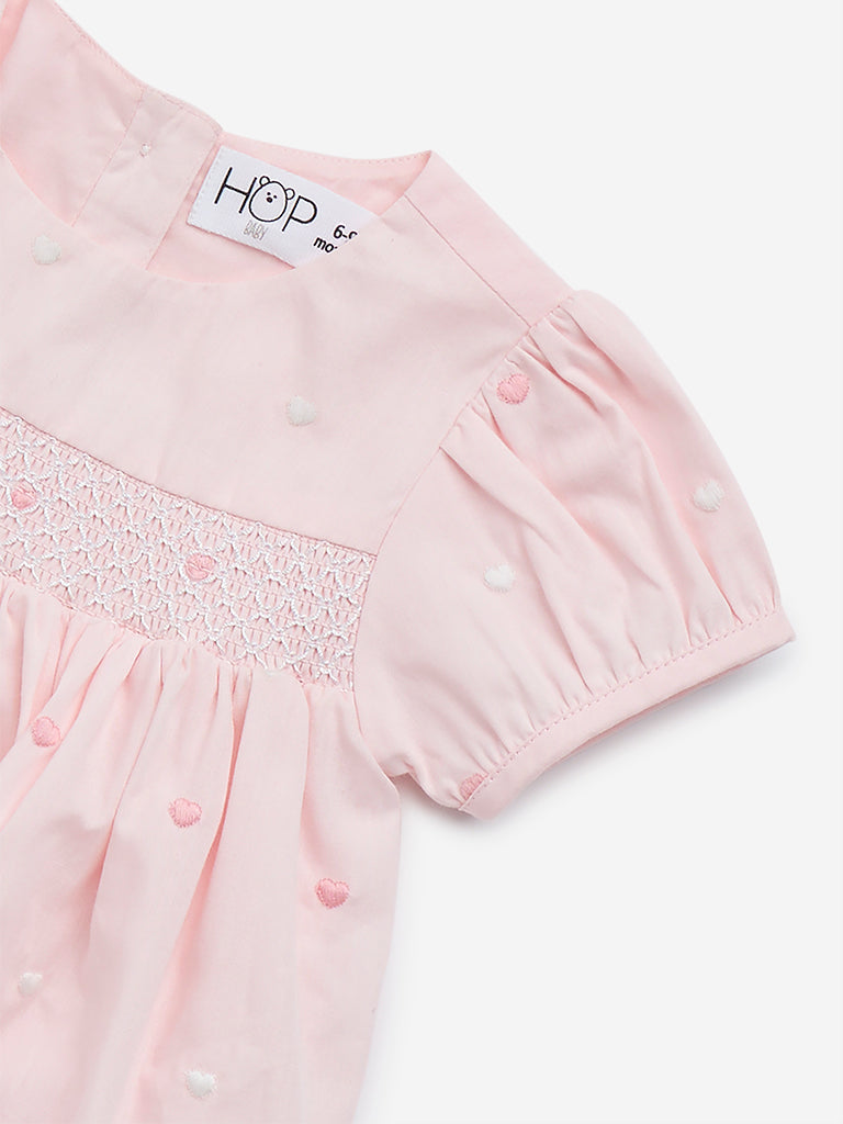 This pink dress by HOP Baby features delicate heart embroidery and a smocked bodice. Crafted from soft cotton. it’s designed with short puff sleeves. adding an adorable touch to your little one’s wardrobe.