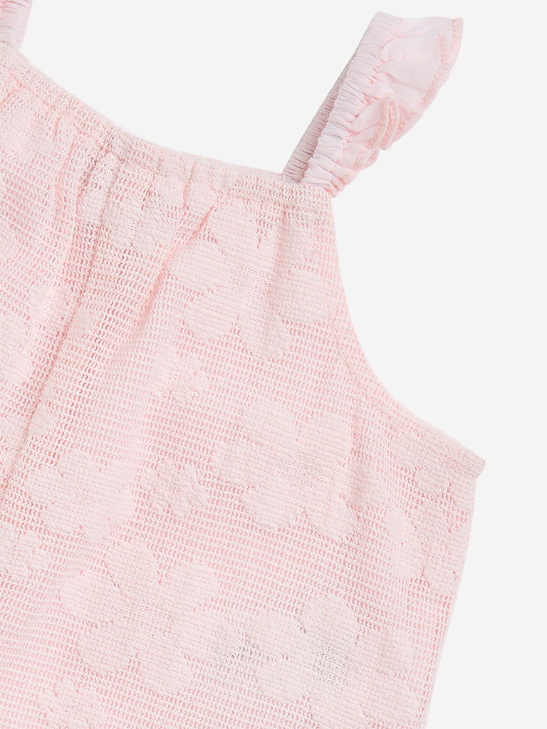 HOP Baby introduces this pink dungaree. crafted from a soft cotton-blend fabric for all-day comfort. Designed with a square neckline. it features ruffled straps for a sweet touch. while delicate floral motifs lend a playful charm.