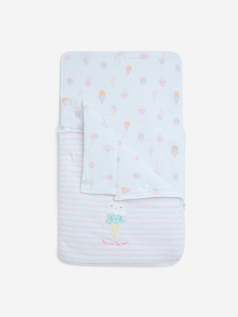 Wrap your little one in comfort with this pink stripe printed sleeping bag from HOP Baby. Featuring playful ice-cream motifs and crafted from pure cotton. it provides a soft. breathable cocoon for restful sleep.