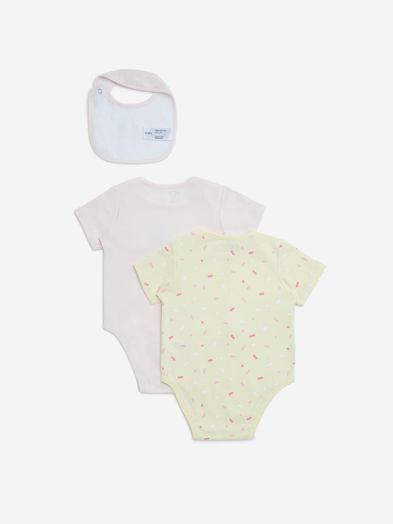 HOP Baby presents this multicolour romper set in cheerful pink and yellow variants. crafted from pure cotton for a soft feel. The pink romper is detailed with a strawberry motif. while the yellow one features abstract prints. Designed with round necks. short sleeves. and bottom button closures for convenience. the set is completed with a matching bib in a playful strawberry print—making it both adorable and practical for everyday wear.