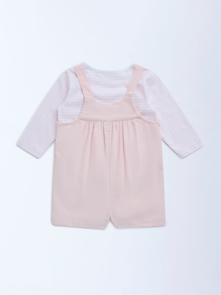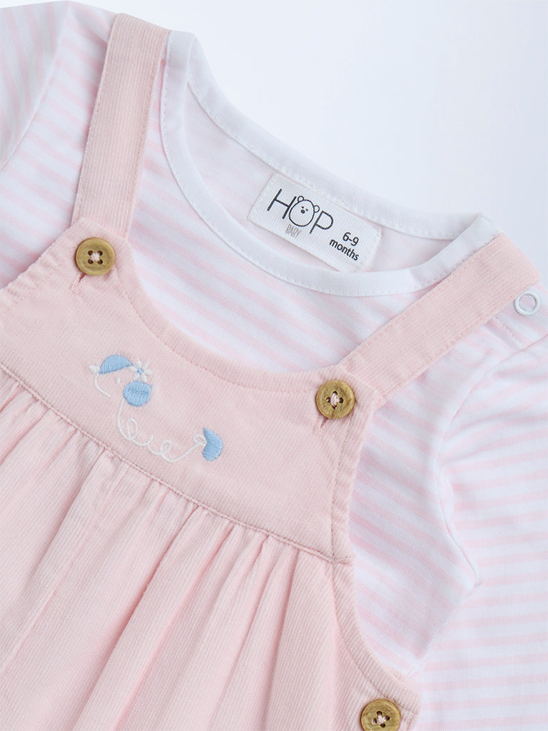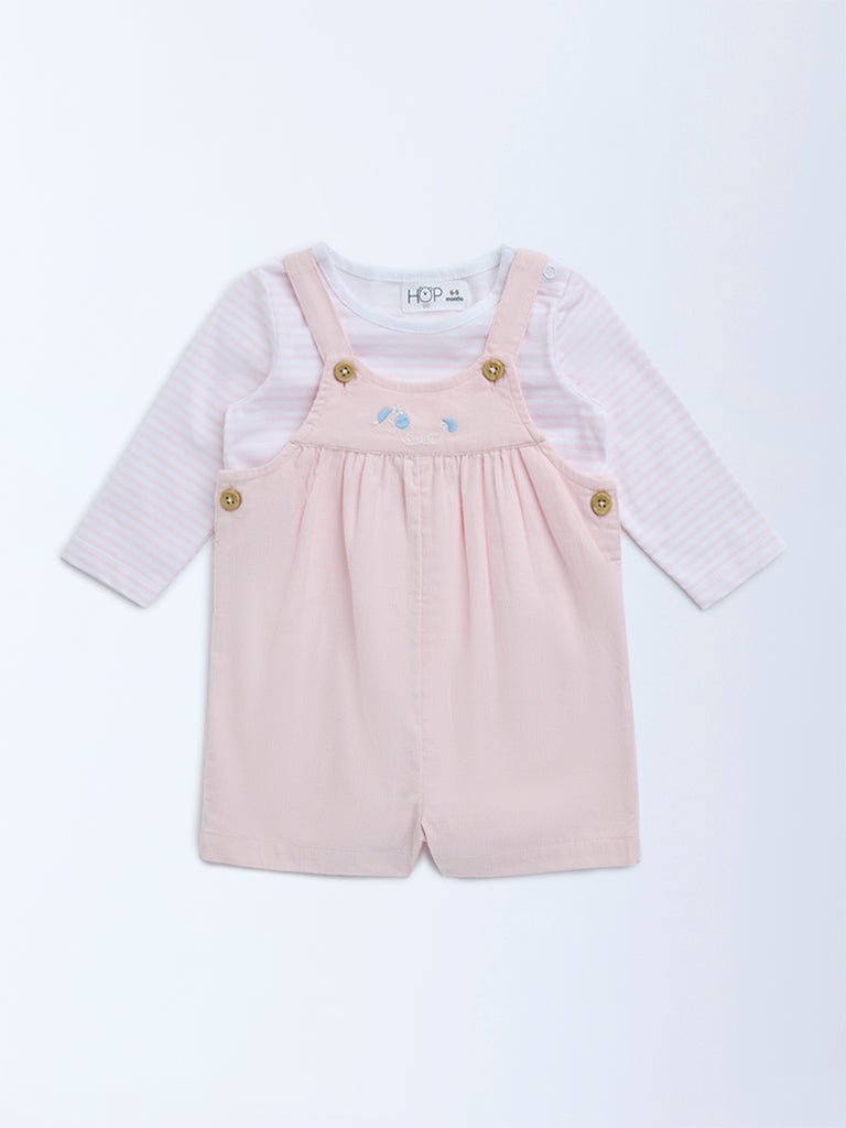 HOP Baby Pink Striped Cotton Dungaree with T-Shirt Set