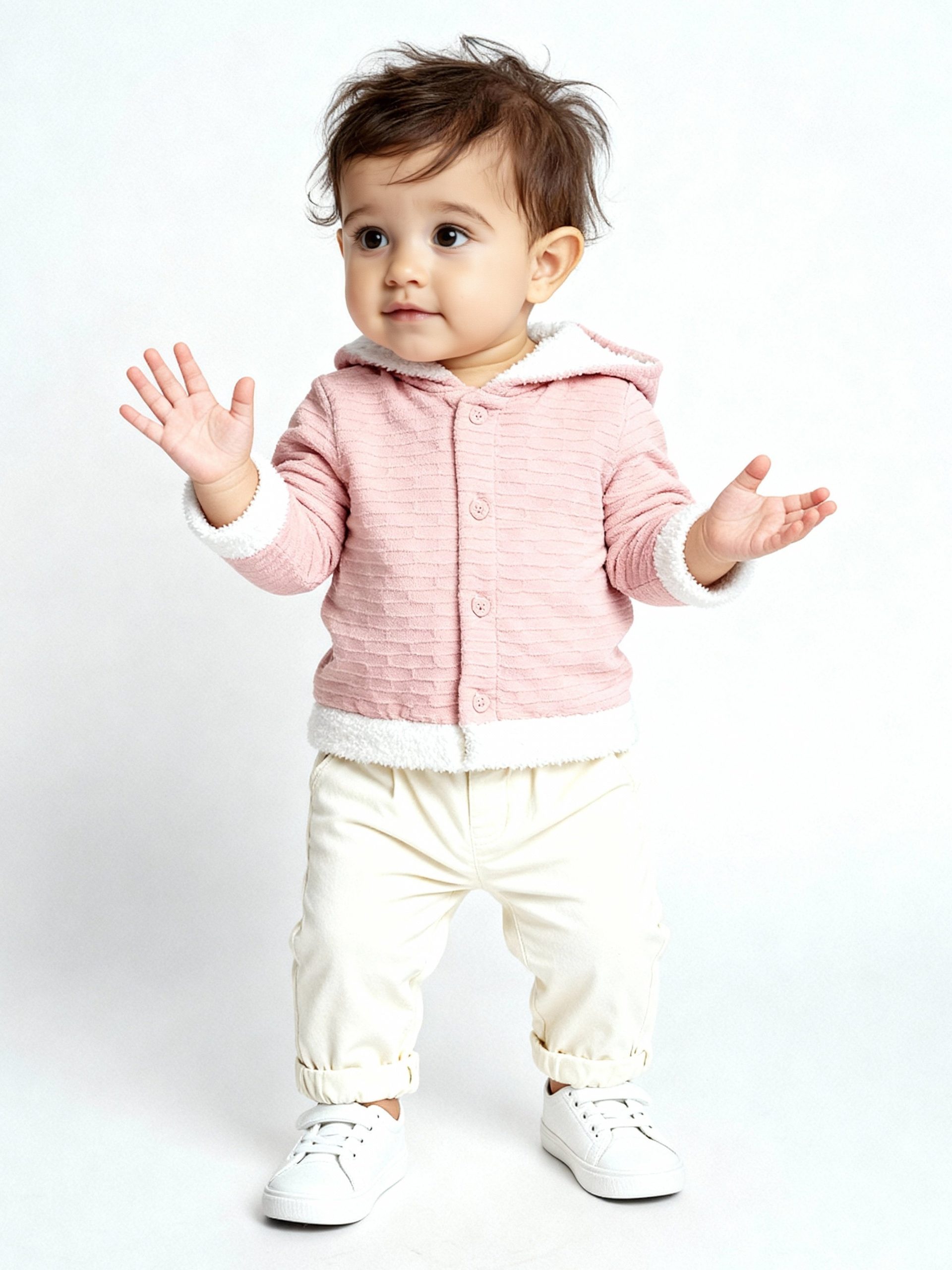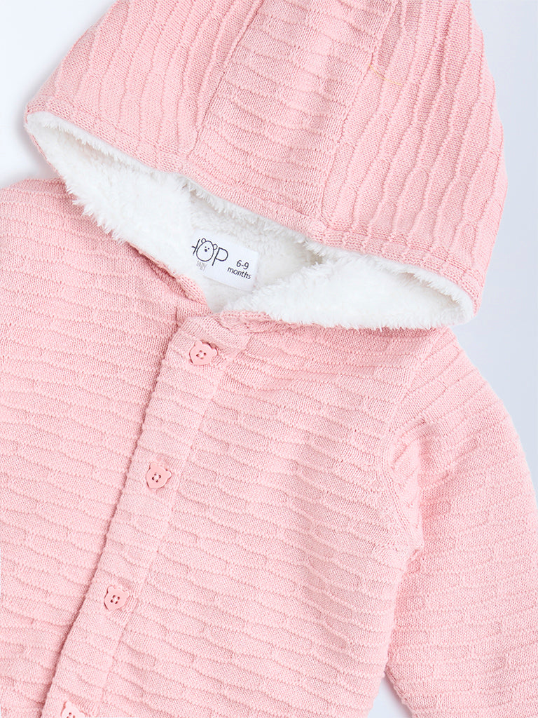 This pink sweater from HOP Baby is designed with a cozy hood. a button-up front and full sleeves for a warm feel. Knitted from soft cotton fabric with a textured pattern. it is lined with plush fleece that feels gentle on the skin. This is a charming layer to keep your little one snug through the season.