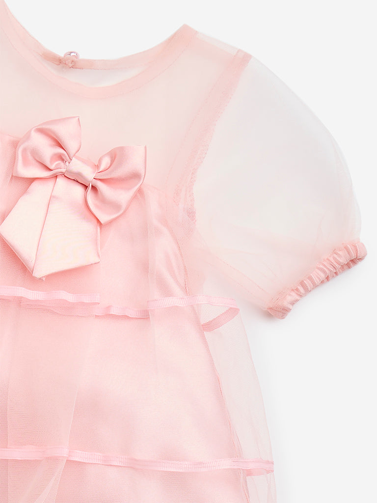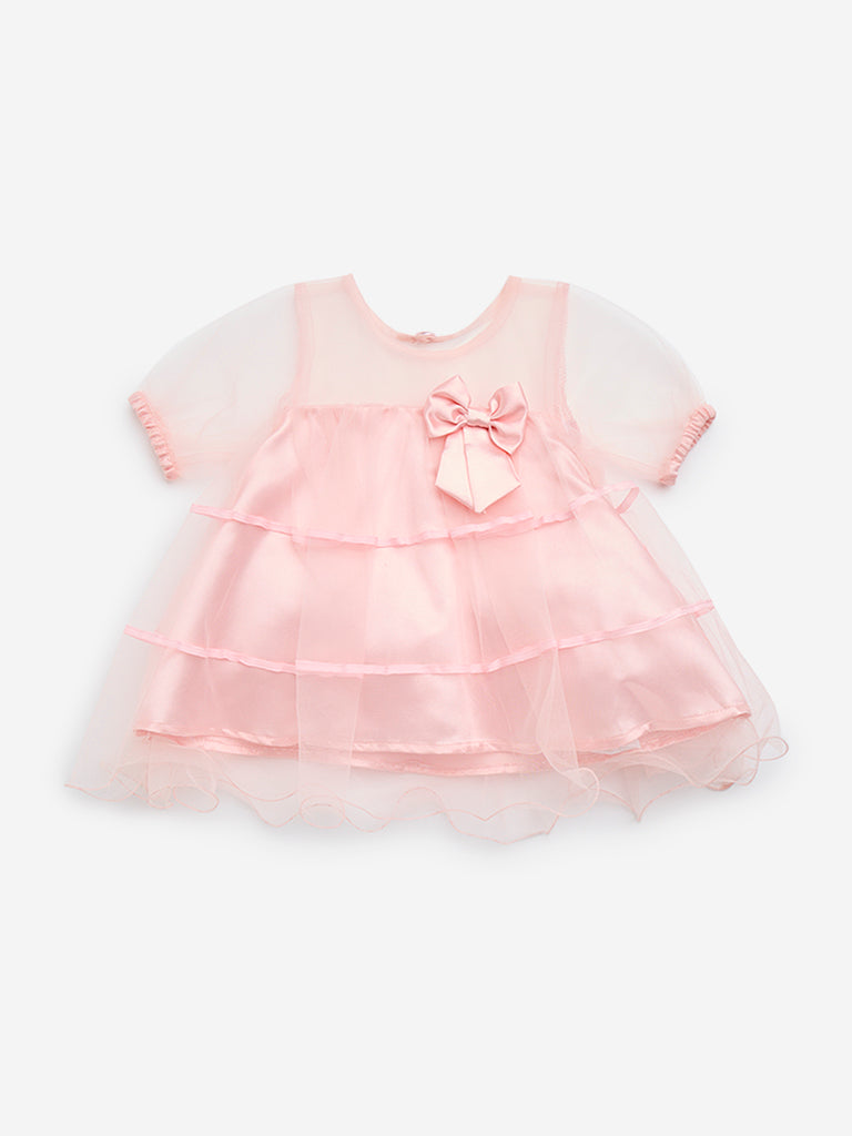 HOP Baby launches this pink organza dress carved in a tiered silhouette. Featuring a bow detail at the front. the breathable garment offers a round neck and puffed sleeves.
