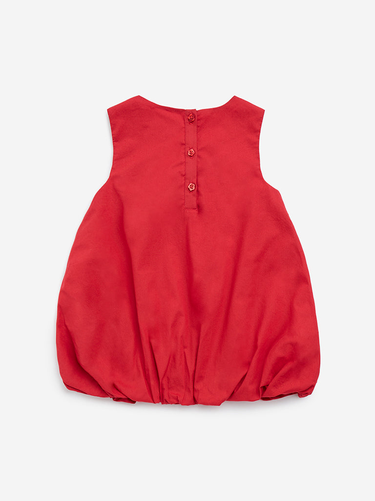 HOP Baby introduces this adorable red balloon dress. crafted from pure cotton for maximum comfort. The dress features a charming bow accent. complemented by a round neckline and sleeveless design.