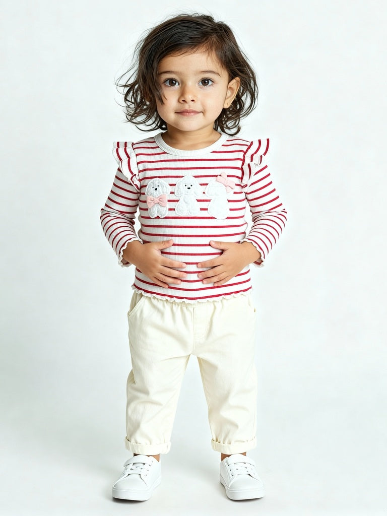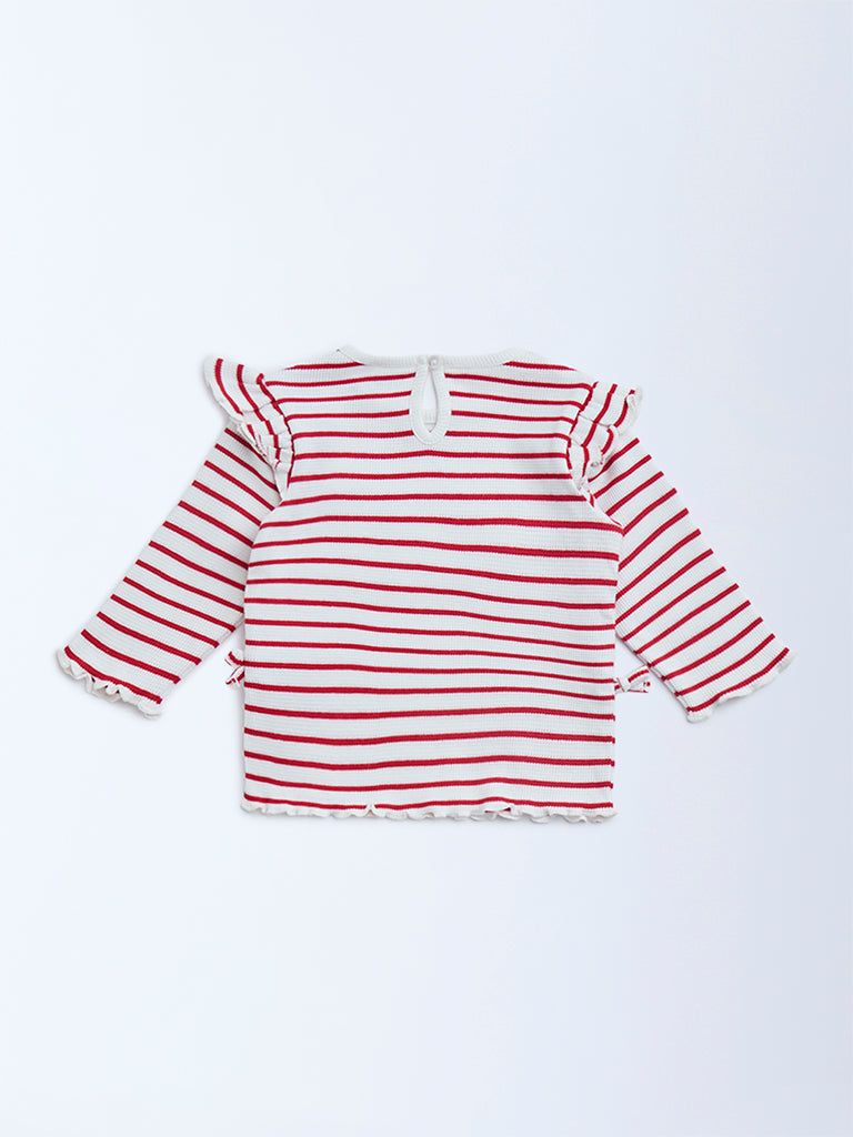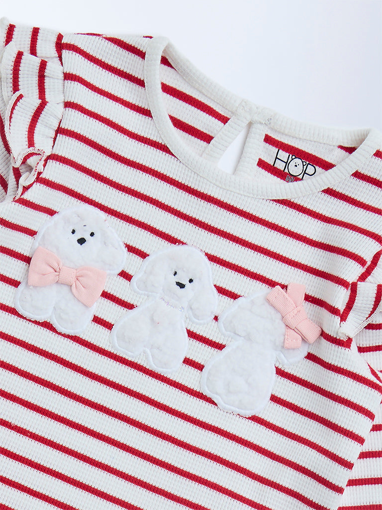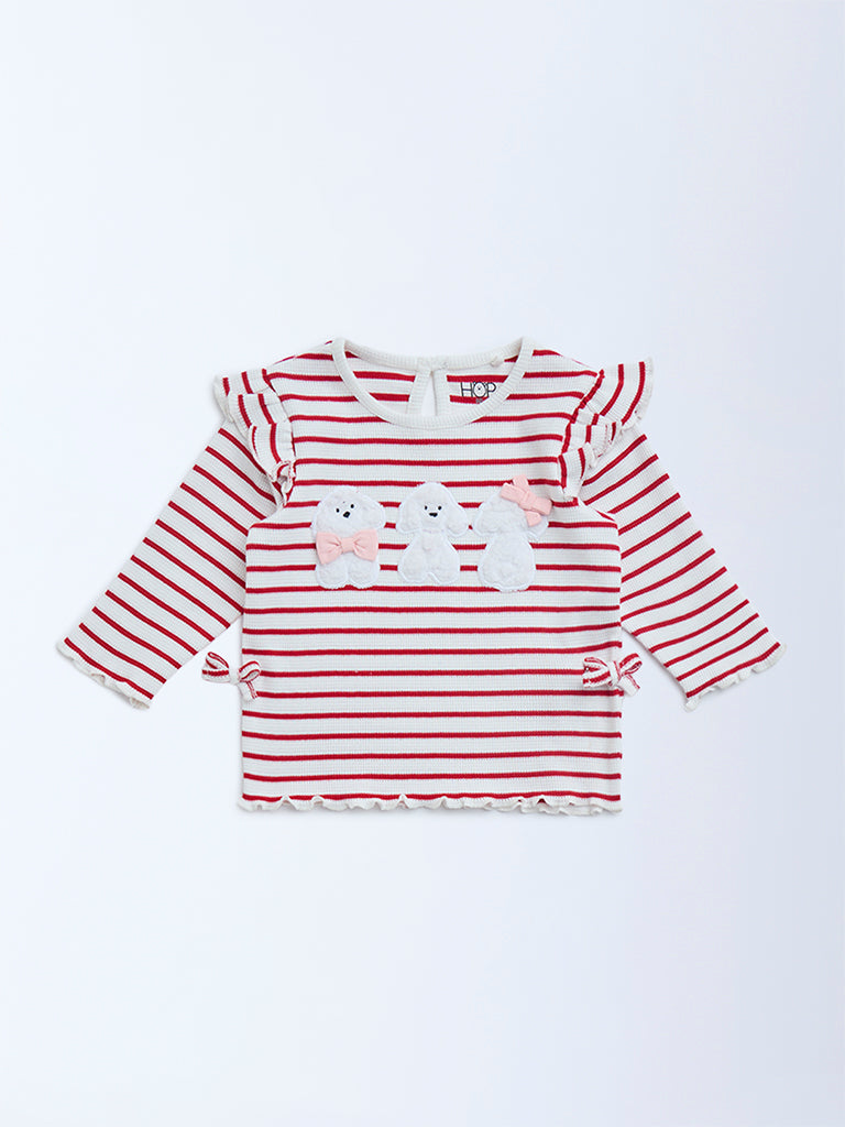 Brighten little days with this red striped top from HOP Baby. crafted from pure cotton for all-day comfort. Designed with a round neck and full sleeves. it flaunts frilled shoulders and delicate side bows for charming accents. while playful animal patches enliven the front.