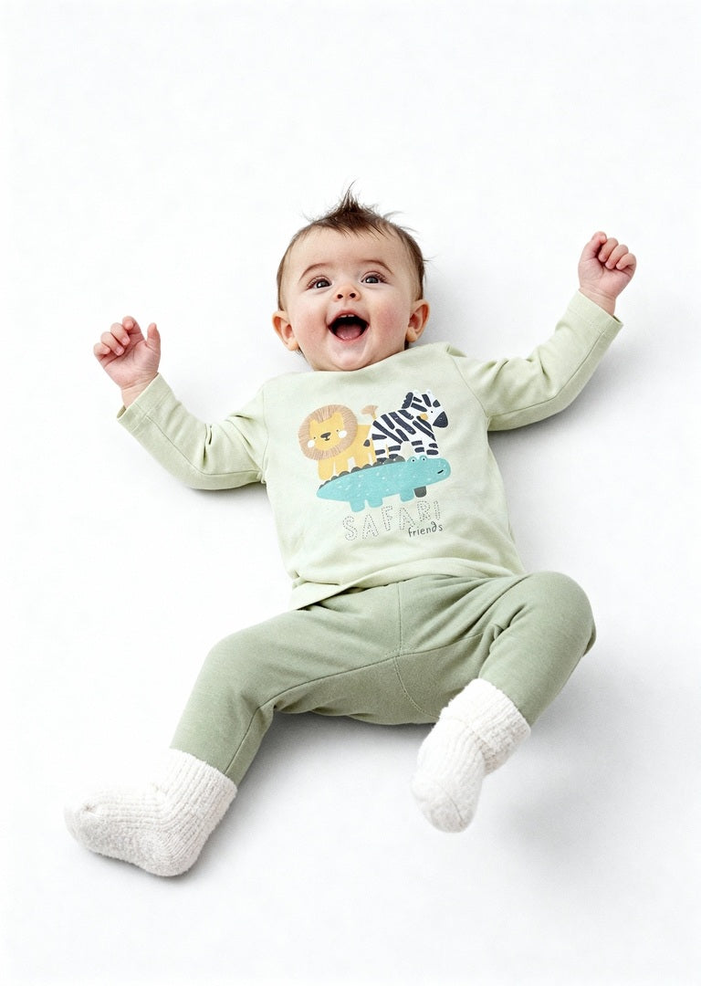 Everyday becomes an adventure with this sage set by HOP Baby. Made from breathable cotton. the crew neck tee is detailed with playful animal prints that sparks a sense of wonder. Soft pants in a matching tone give babies the freedom to crawl. wriggle. and explore. Designed with easy snap buttons on the shoulder for stress-free dressing. this set balances charm and practicality.