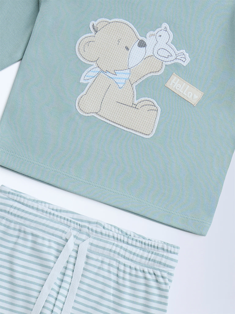 Cuddle-ready comfort meets playful charm in this sage set from HOP Baby. The long-sleeved tee features a crew neck with snap buttons on the shoulder and a whimsical teddy bear patch. while the striped pants come with an elasticized drawstring waist for an adjustable fit.