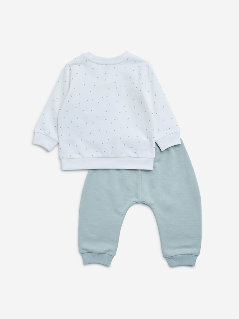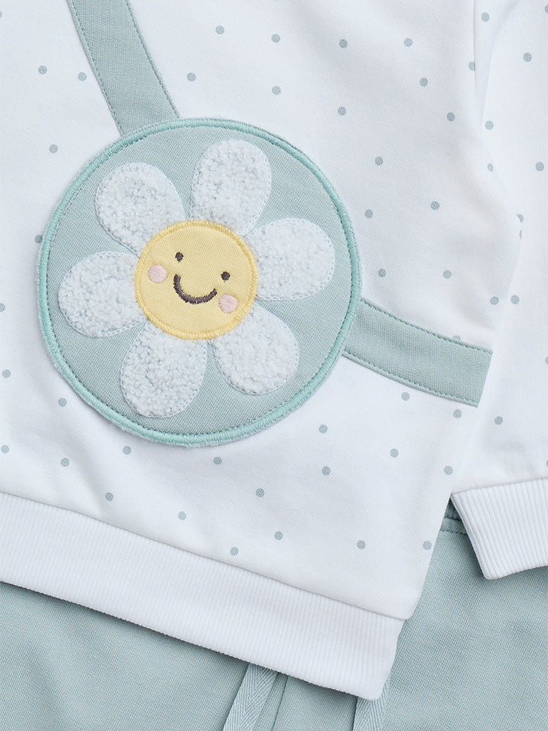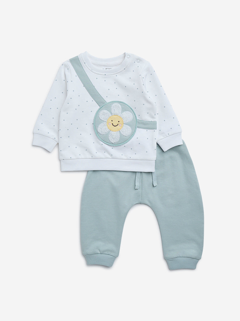 This sage set by HOP Baby includes a t-shirt with pants. Adorning a floral appliqué. the white tee includes a crew neck and full sleeves. It is accompanied by a pair of pants with an elasticated drawstring waistband for a snug fit.