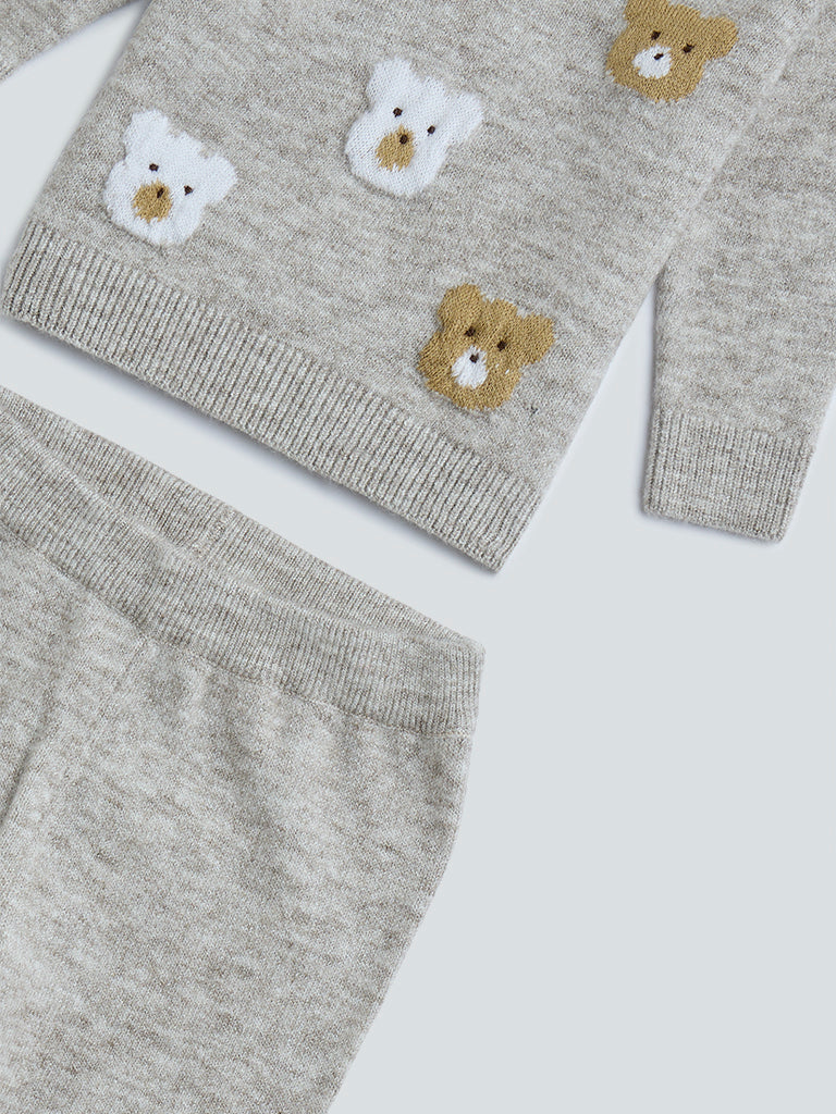 Keep little ones wrapped in comfort with this taupe melange winter set from HOP Baby. The sweater is adorned with embroidered teddy motifs and is framed by a round neck and full sleeves. Matching joggers with an elasticated waist complete the set. making it as cosy as it is cute.