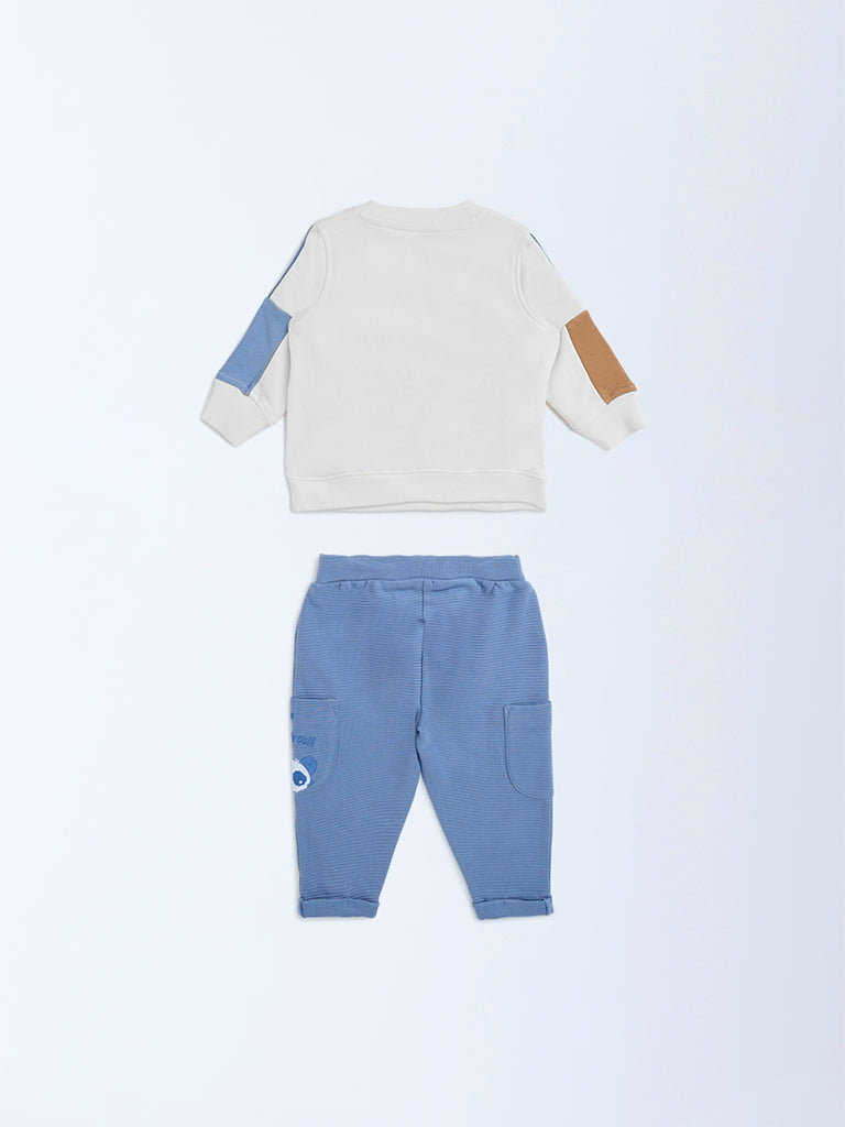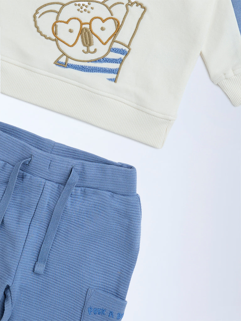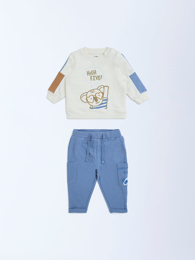 Designed for everyday comfort. this white set from HOP Baby is crafted from a soft cotton blend. The tee features a playful animal design with full sleeves and a crew neck for easy wear. Paired with blue elastic-waist pants finished with drawstrings and pockets. it blends charm with everyday practicality.