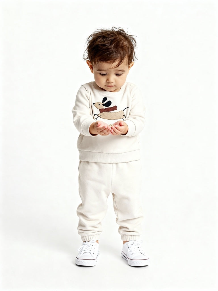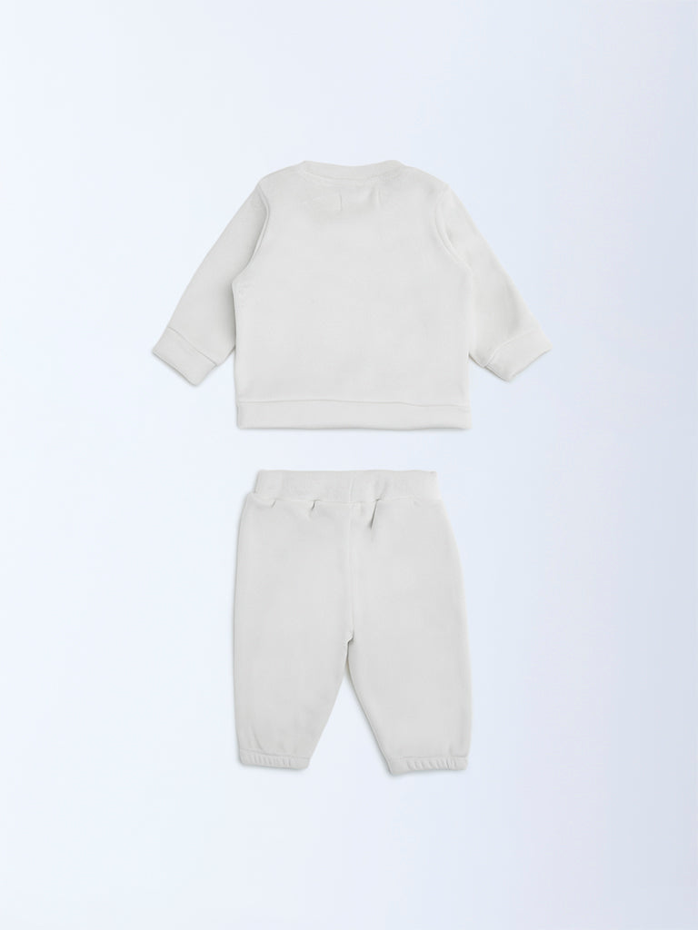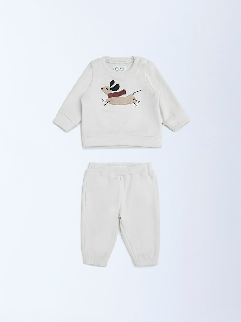 Perfect for play and lounging. this white set from HOP Baby includes a cozy top with adorable animal embroidery at the front. styled with a crew neck and full sleeves. Paired with matching elasticated pants. the soft lightweight fabric keeps little ones comfortable through the day while looking sweet and coordinated.