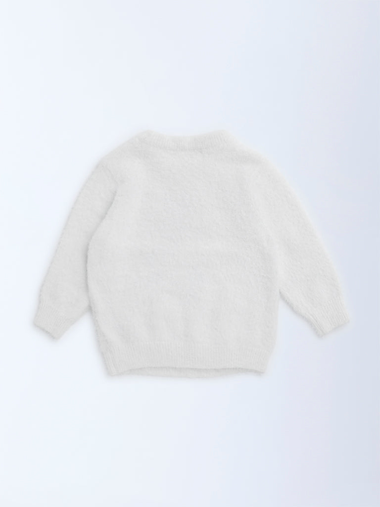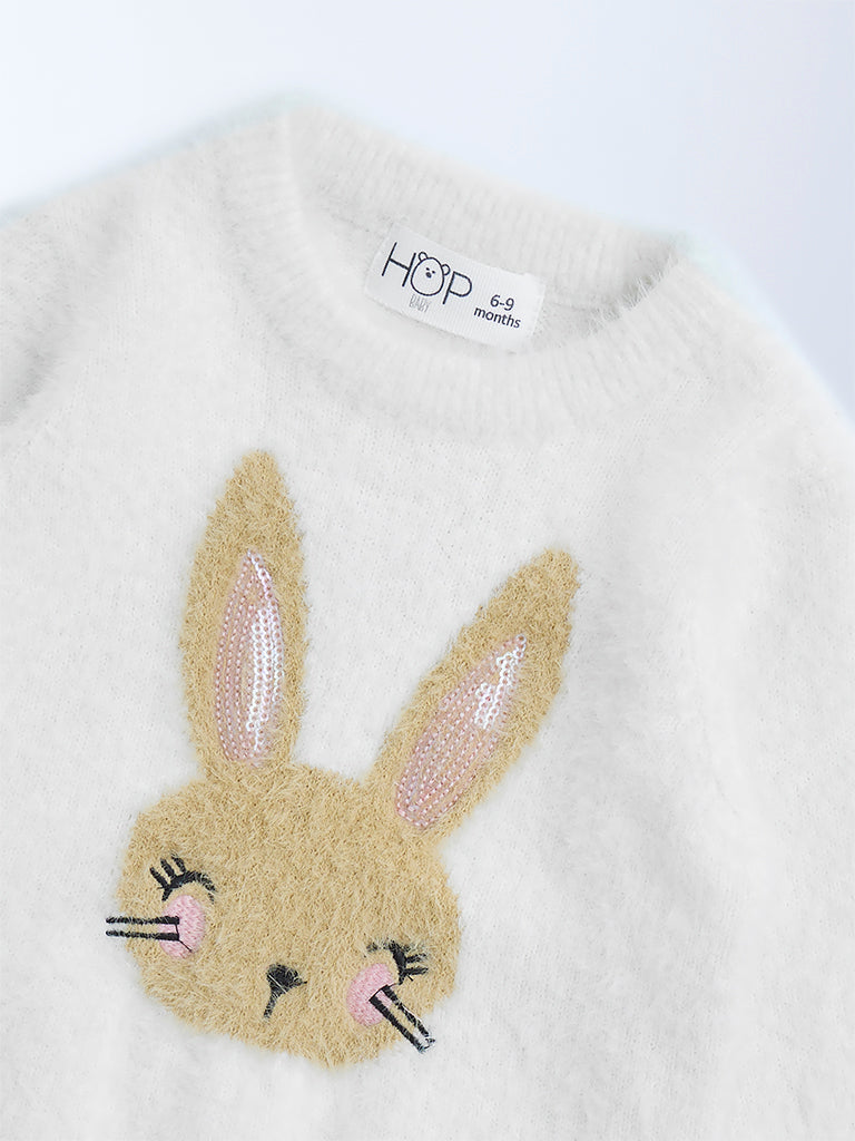 Keep your little one snug and sweet in this white sweater from HOP Baby. Featuring an adorable bunny face at the front. it’s designed with a round neckline and long sleeves for a gentle. cosy fit. The soft fleece lining adds extra warmth. making it perfect for chilly days and cuddle time.
