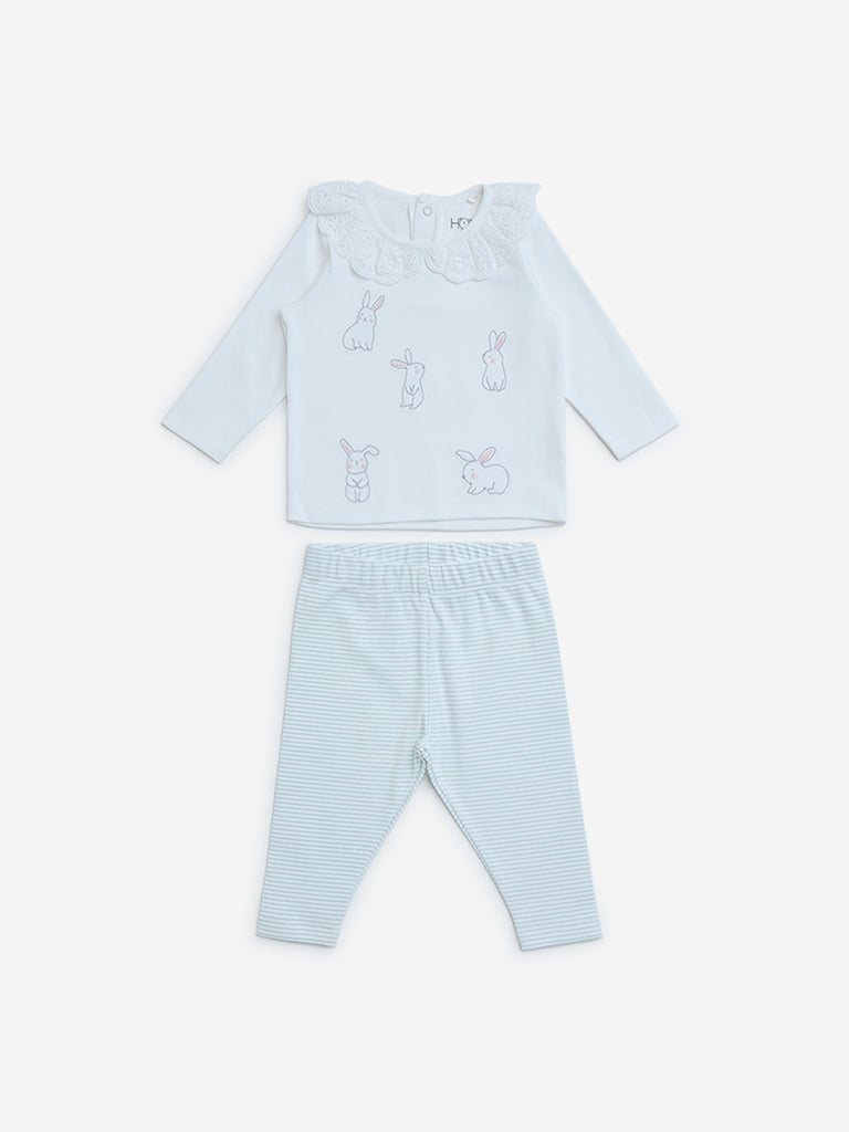 HOP Baby White Bunny Embroidered Cotton Top and Pants Set