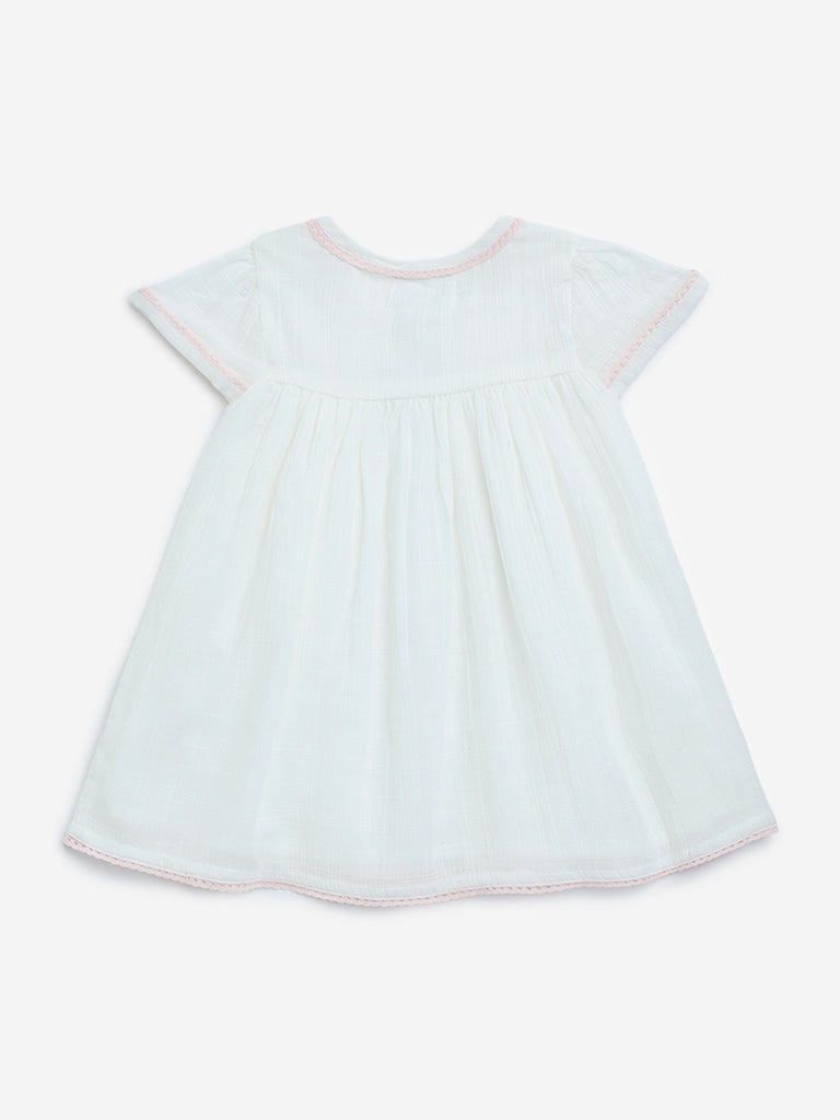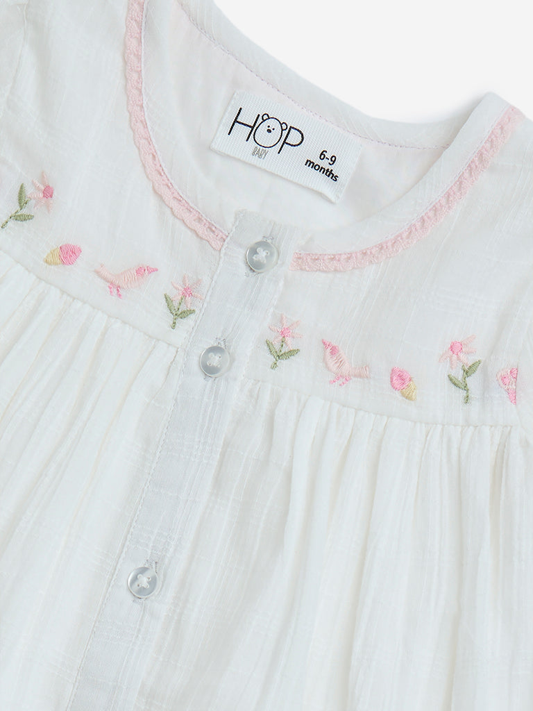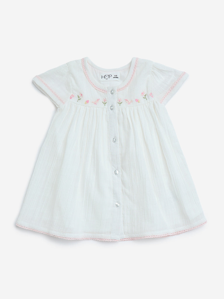 This white dress from HOP Baby showcases embroidered motifs on the bodice. This pure-cotton garment features an A-line silhouette. carries a round neck. cap sleeves and a button-up front. offering a charming option for outings and playtime.