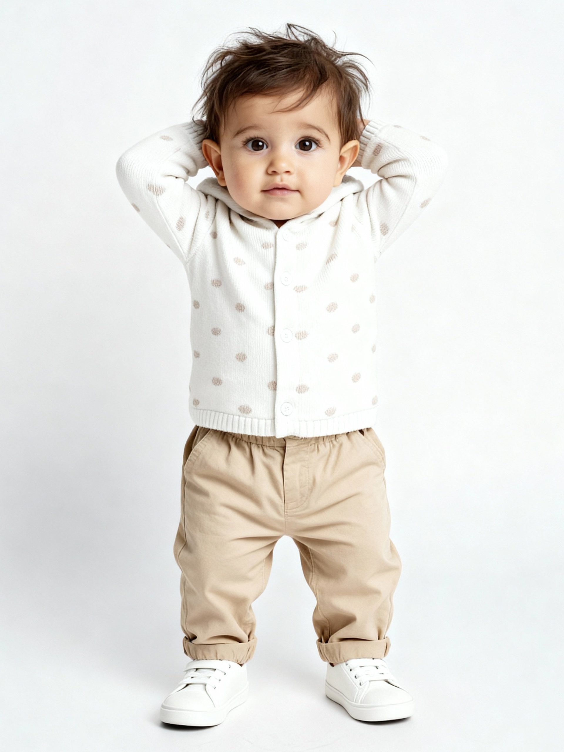 HOP Baby presents this white sweater adorned with embroidered motifs all over. Crafted from soft cotton. it features a hood detailed with playful bear ears and a button-up front for easy dressing. Completed with full sleeves. this cozy layer keeps your little one snug and adorable through cooler days.