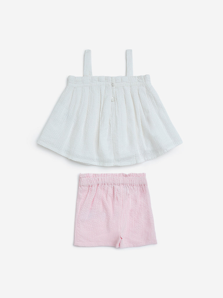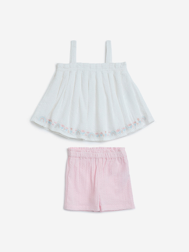 HOP Baby brings this set of top and shorts pair. woven from cotton-rich fabric. The white top is designed with floral embroidery on a crinkle textured layer and features a square-neck and a button-up front. The pink shorts fitted with an elasticated waistband promising a flexible and comfortable fit.