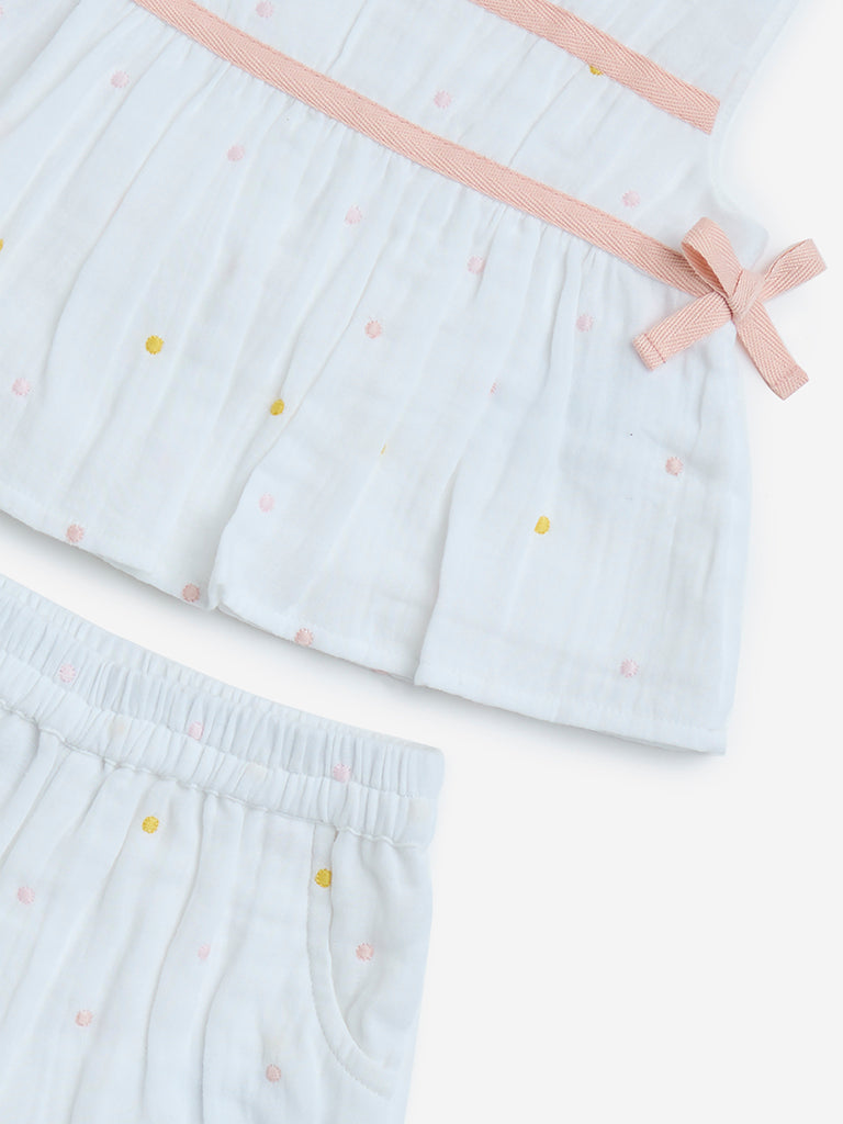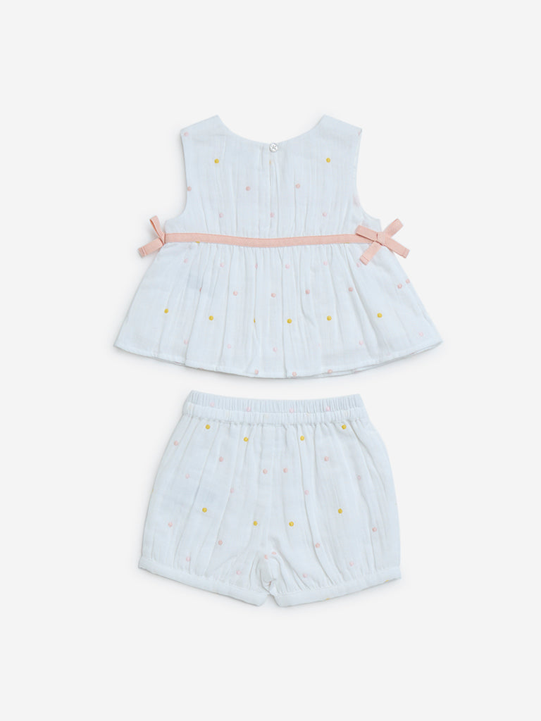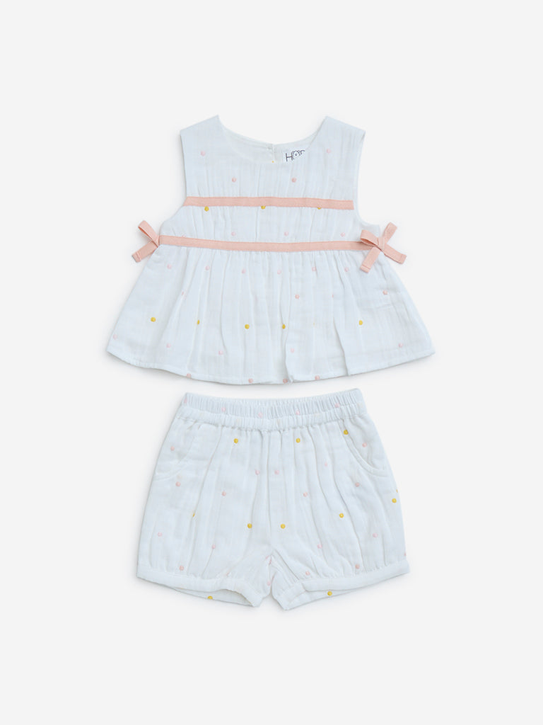 HOP Baby White Polka Dotted Cotton Top with Shorts Set