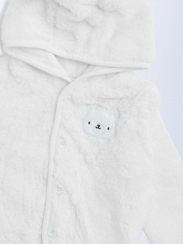 A cozy essential for chilly days. this white faux-fur jacket from HOP Baby is crafted from a plush fabric blend that feels soft and gentle on delicate skin. Designed with a hood. zipper placket and kangaroo pockets. it is finished with a sweet teddy motif at the back. adding playful charm while keeping little ones snug and warm.