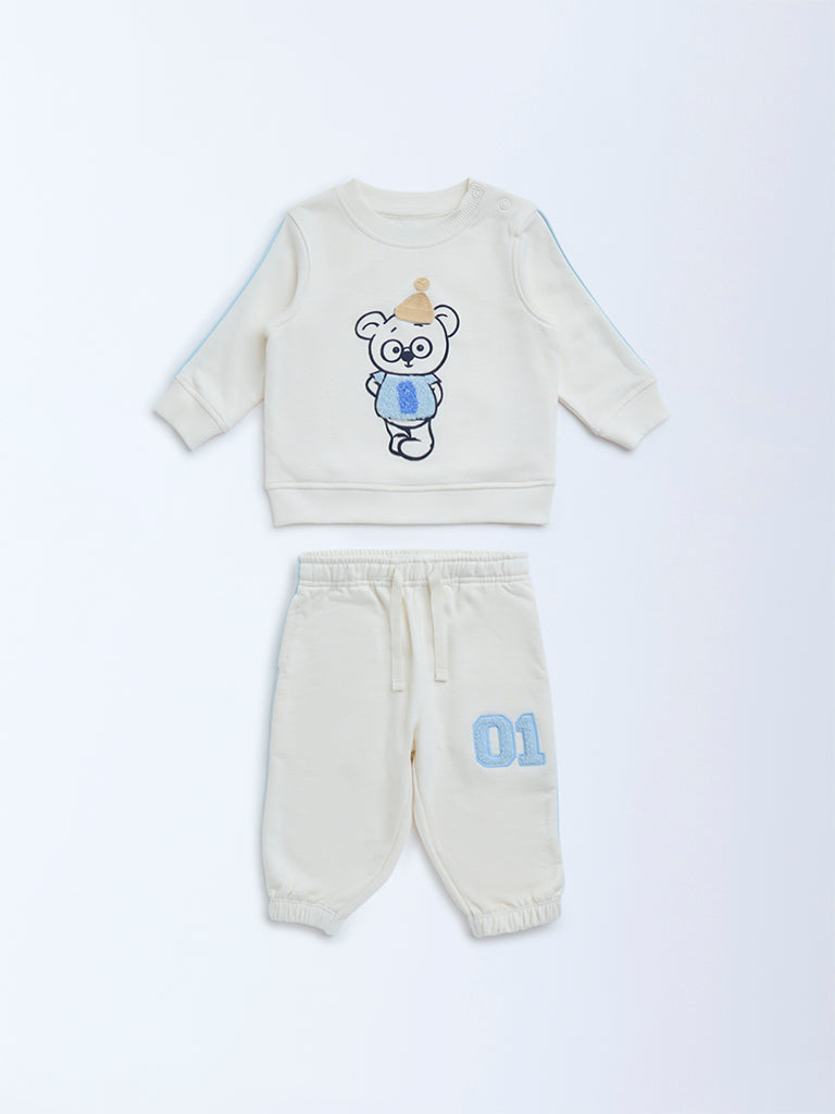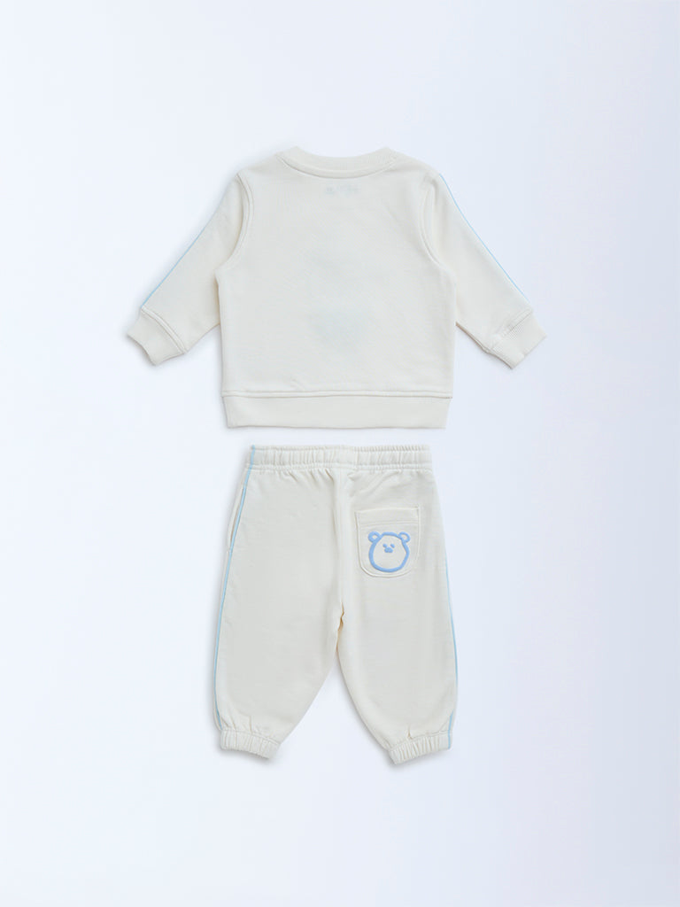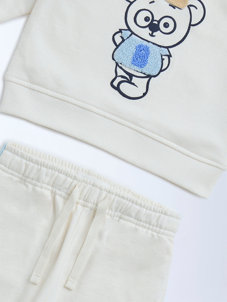 HOP Baby White Teddy Printed Cotton T-Shirt and Pants Set