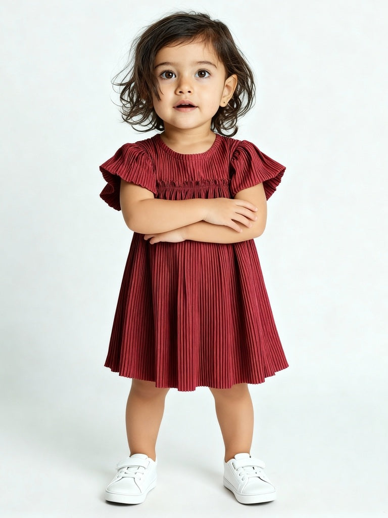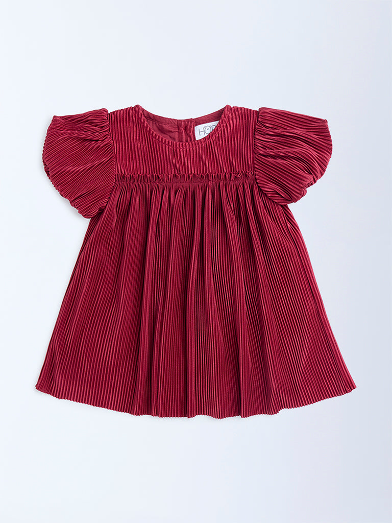 This wine dress from HOP Baby is shaped in an A-line silhouette. designed with a round neck and puff sleeves. Made from high-quality fabric. it features a self-striped patterns that enhances its elegant appeal.