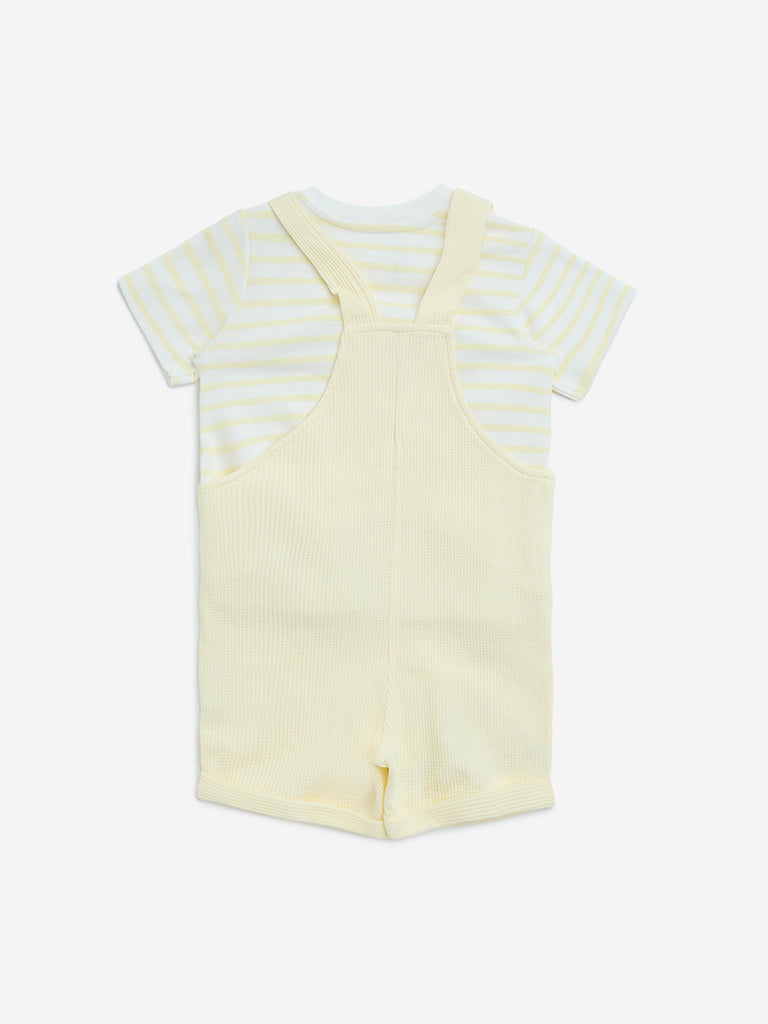 Brighten up your little one’s wardrobe with this yellow t-shirt and dungaree set from HOP Baby. Made from pure cotton. the striped t-shirt features a round neck and short sleeves for everyday comfort. It’s paired with a textured dungaree adorned with embroidered detailing. a front pocket. and buttoned additions for a secure and playful fit.