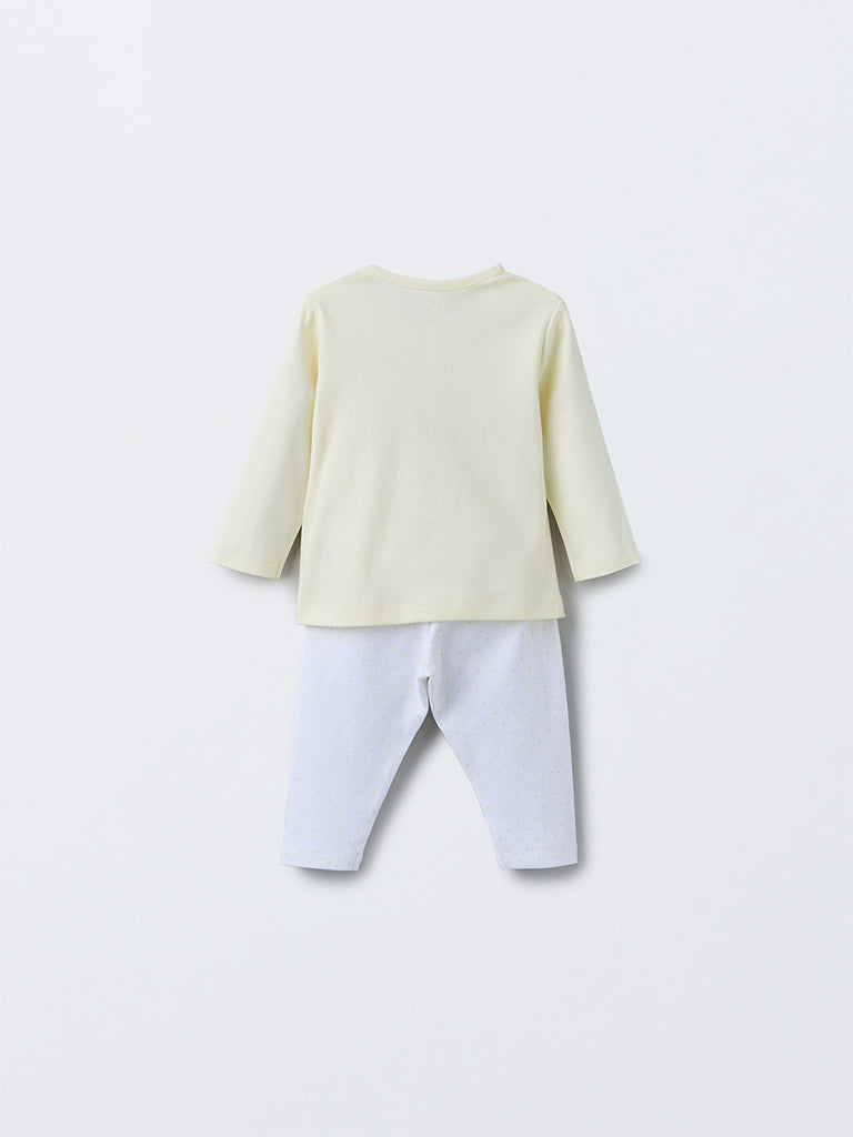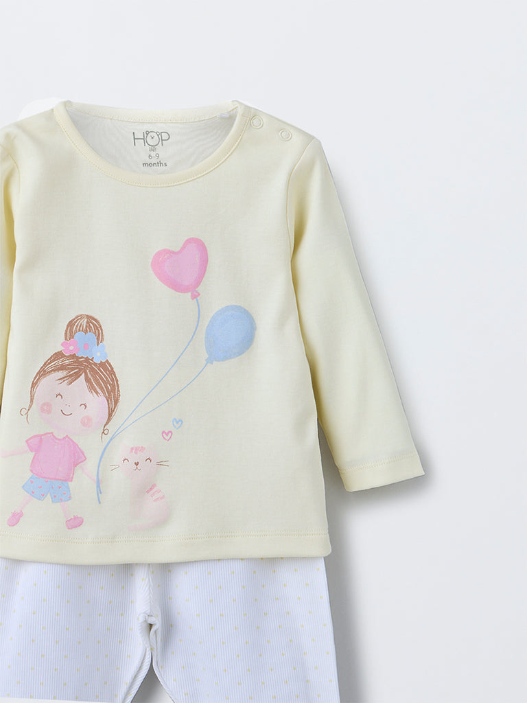 Filled with joy and play. this sweet co-ord set from HOP Baby is made to brighten your little one’s day. The soft yellow tee features a cheerful print. pants bringing a storybook charm to everyday dressing. Fashioned with a round neck and shoulder snap fastening. it offers quick and easy changes. Paired with white bottoms sprinkled with polka dots. the set blends comfort with whimsy.