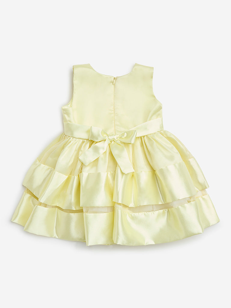 HOP Baby presents this yellow dress designed with rosette-detailing. Made from soft and breathable fabric. the garment flaunts a beautiful A-line silhouette enhanced with tiered design and a back knot. It is completed with a round neck and a sleeveless cut.