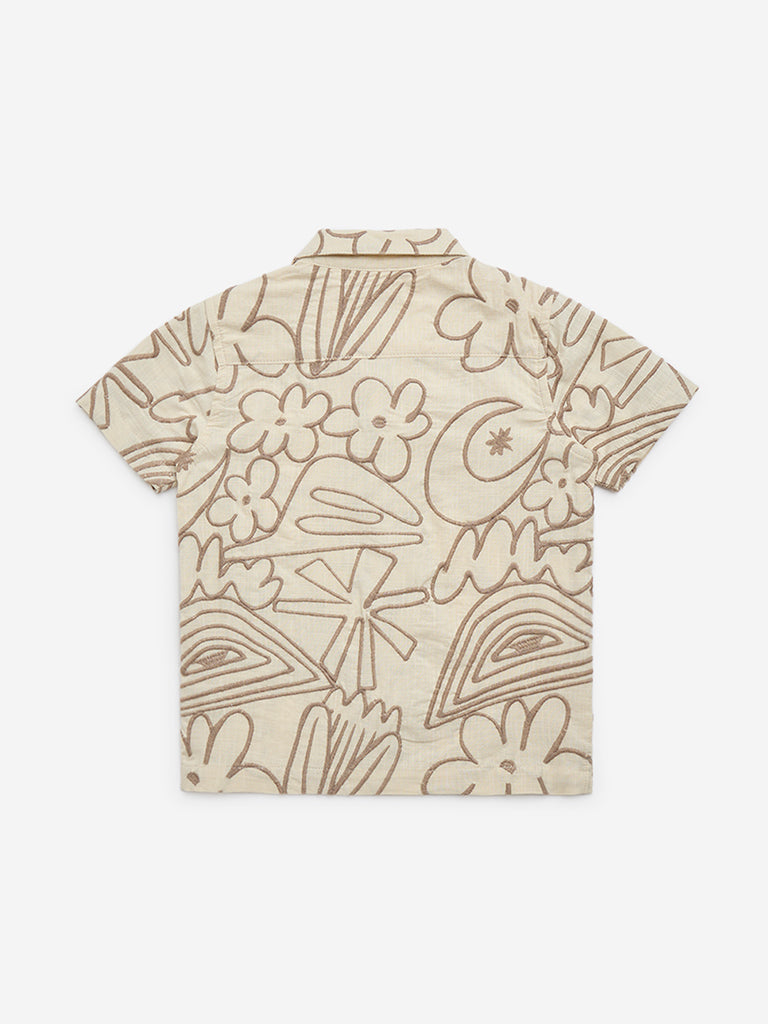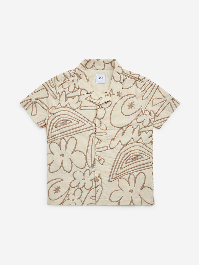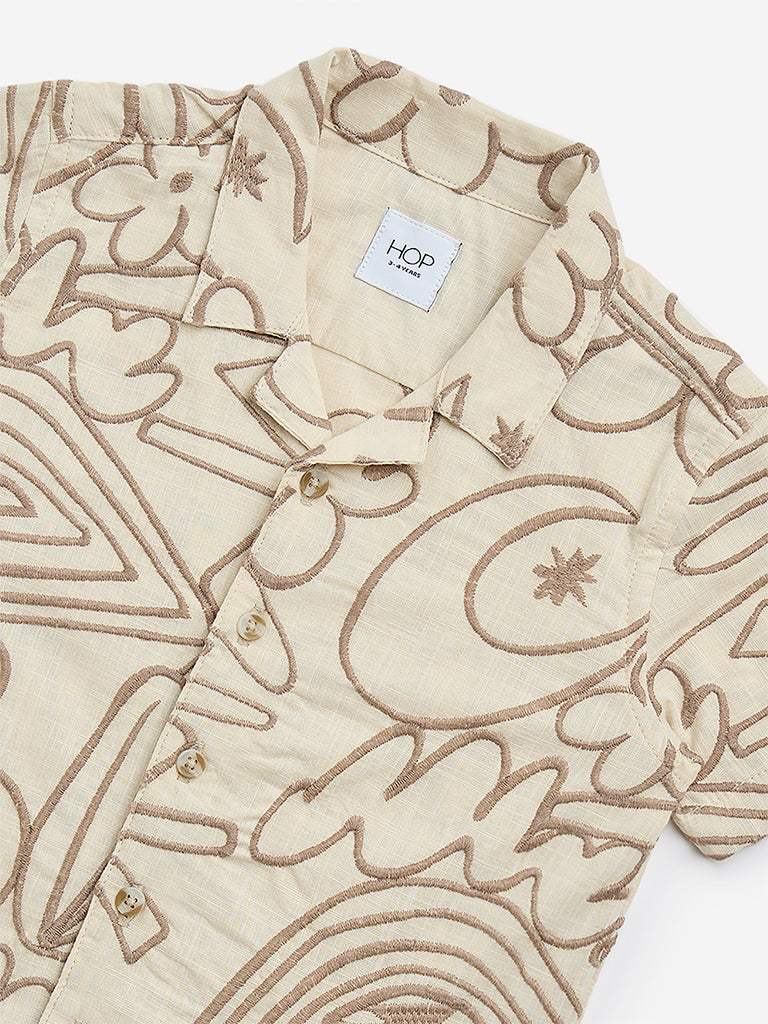Showcasing abstract motifs. this beige shirt from HOP Kids blends playful charm with effortless style. Crafted from a breathable cotton-blend fabric. it features a camp collar and short sleeves. ensuring a comfortable fit for all-day wear.
