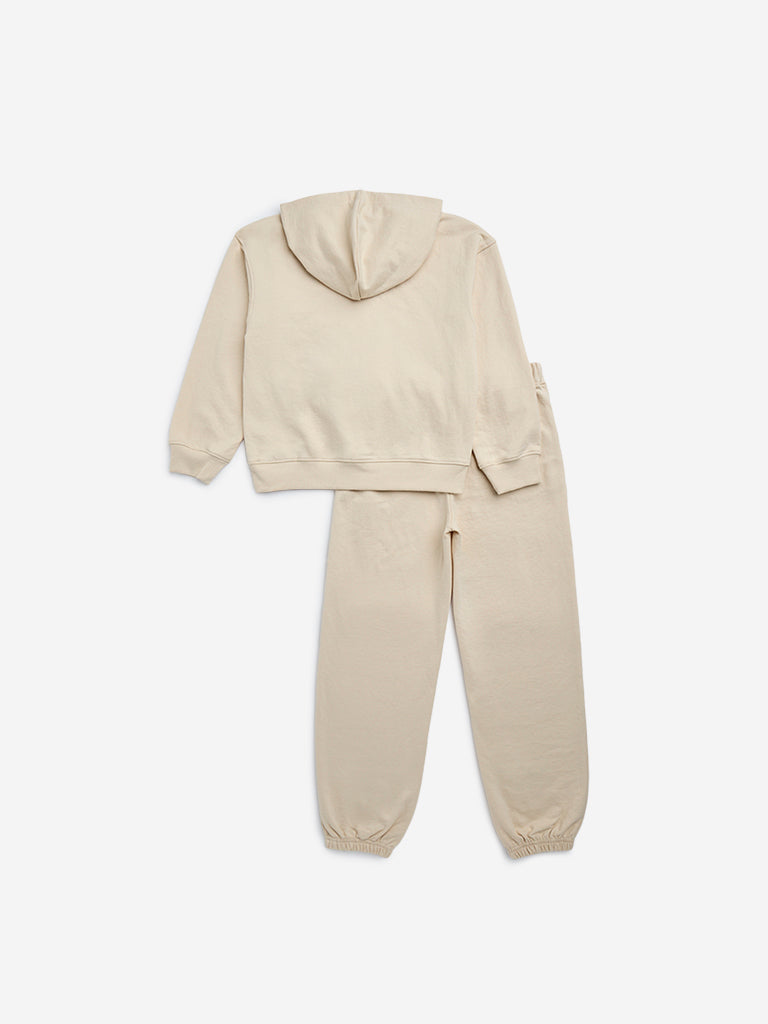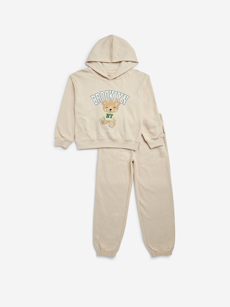 This beige set by HOP kids comprises of a sweatshirt and pair of joggers. Showcasing playful teddy designs. the sweatshirt boasts a hood and full sleeves. It is accompanied by matching joggers with an elasticated waistband for a snug fit.