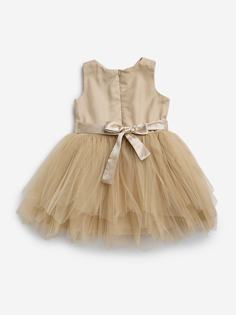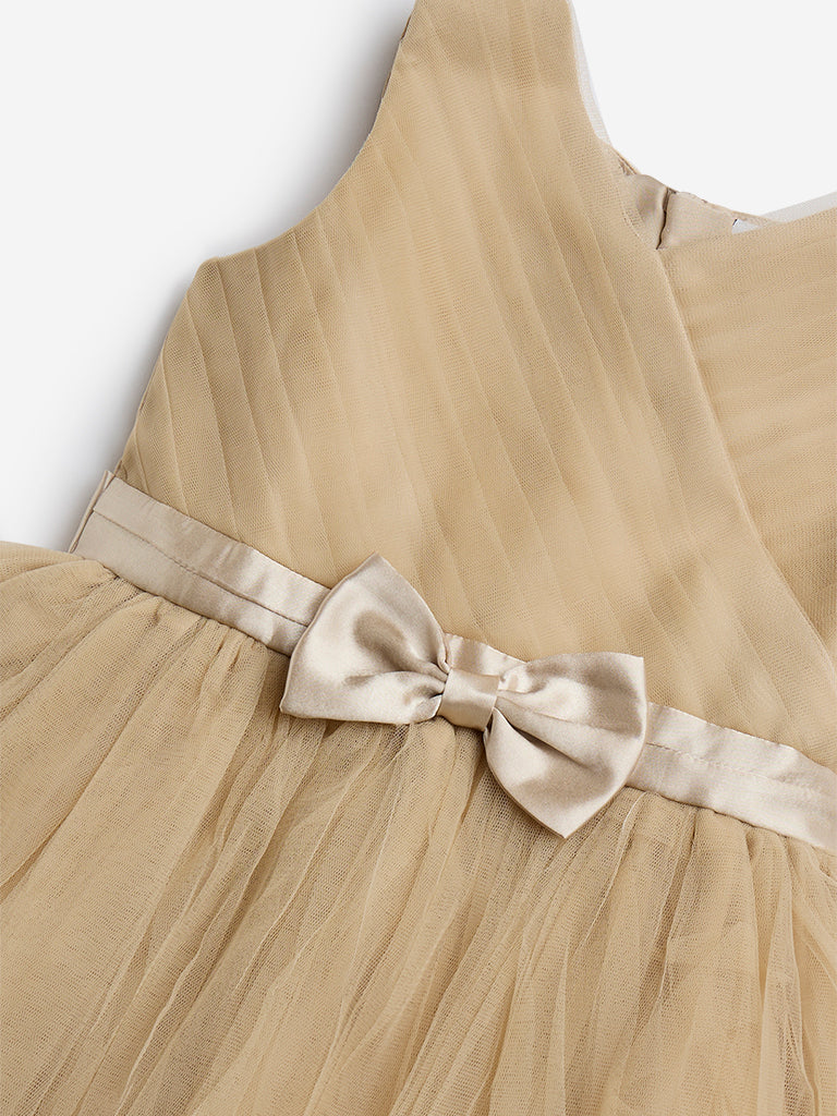 HOP Kids Beige Bow Design Mesh A-Line Dress