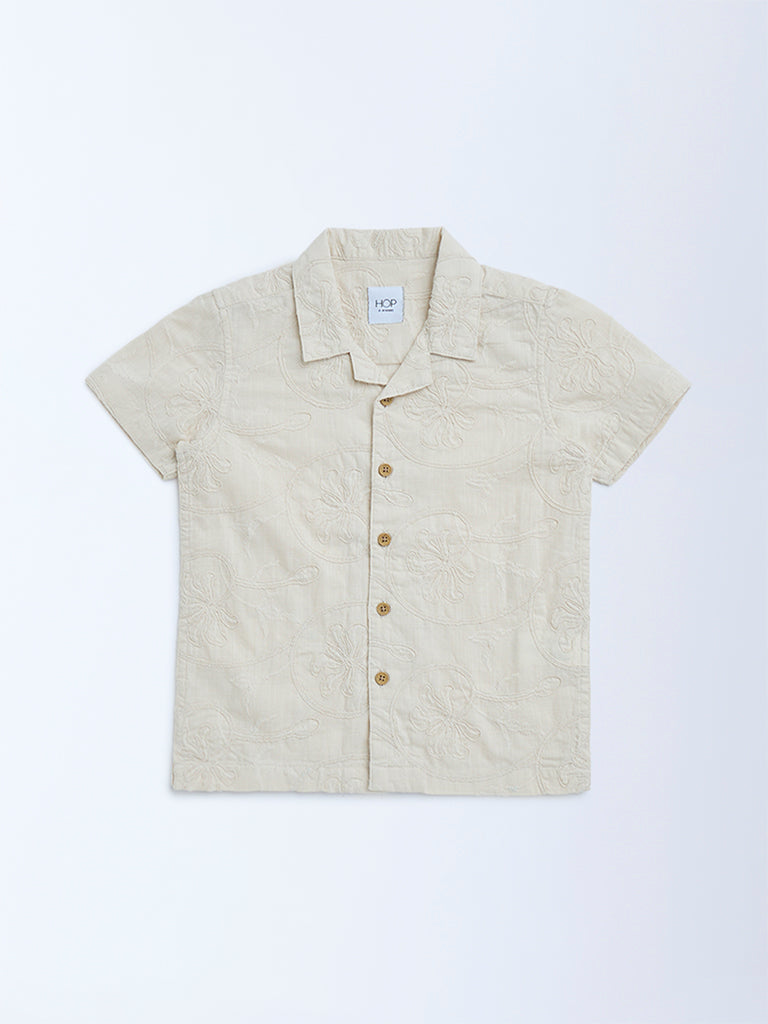 Perfect for playtime adventures and breezy outdoor moments. this beige shirt from HOP Kids is made from pure cotton for all-day comfort. Detailed with subtle floral embroidery. it’s styled with a camp collar. short sleeves. and a clean button placket.