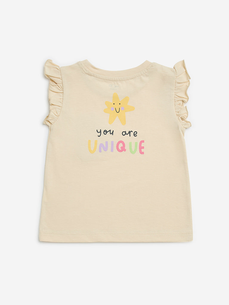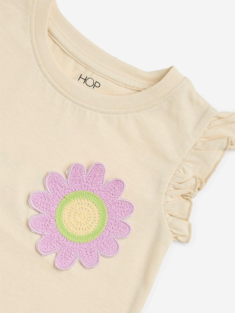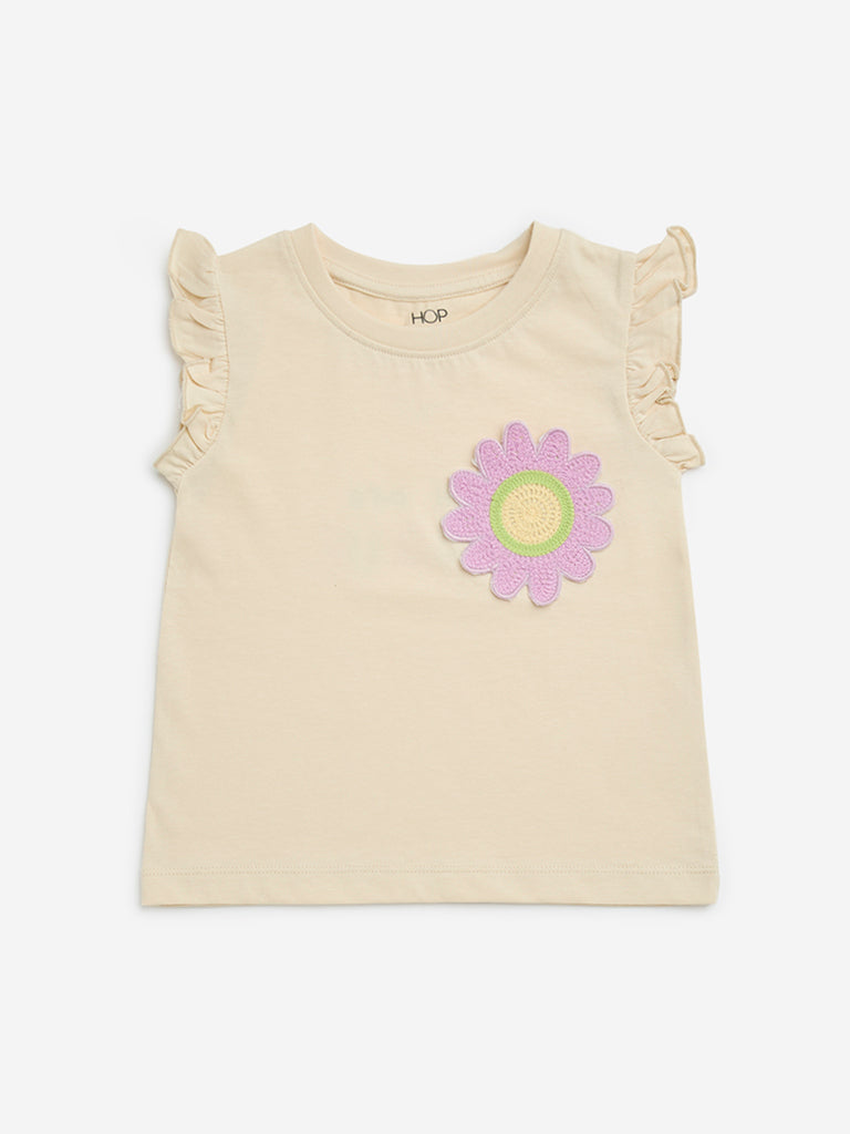 This beige top from HOP Kids is adorned with adorable floral embroidery at the front and playful text prints at the back for added charm. Spun from a cotton-rich fabric. it features a classic round neck and ruffled sleeves for a sweet and stylish finish.