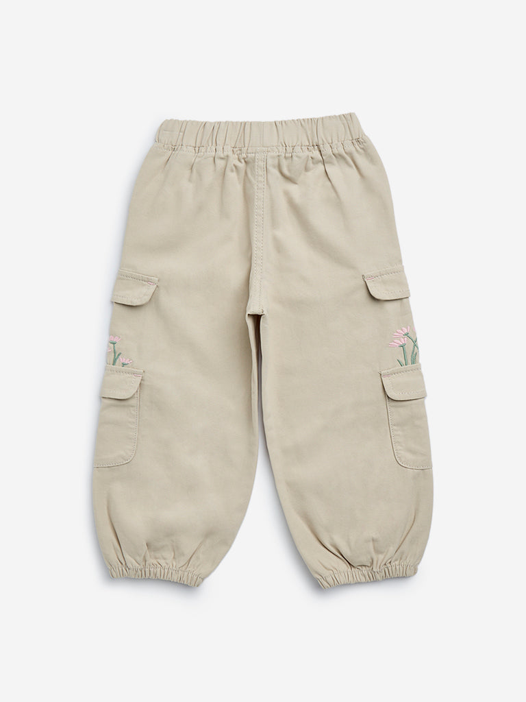 HOP Kids Beige Floral Embroidered High-Rise Cotton Trousers