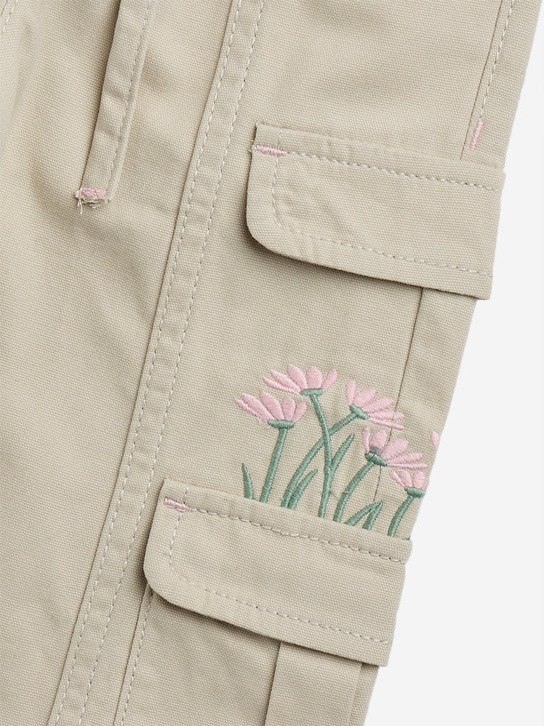HOP kids introduces these beige trousers boasting delicate floral embroidery. Made from pure-cotton. the high-rise pair is fitted with an elasticated drawstring waistband and multiple pockets.