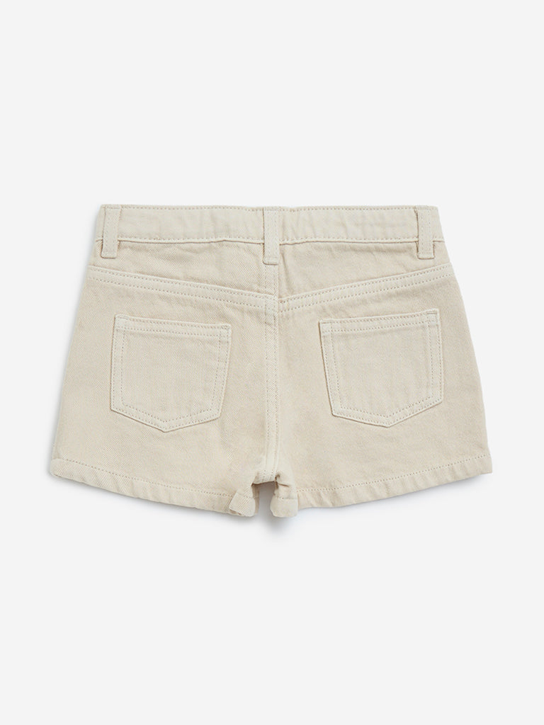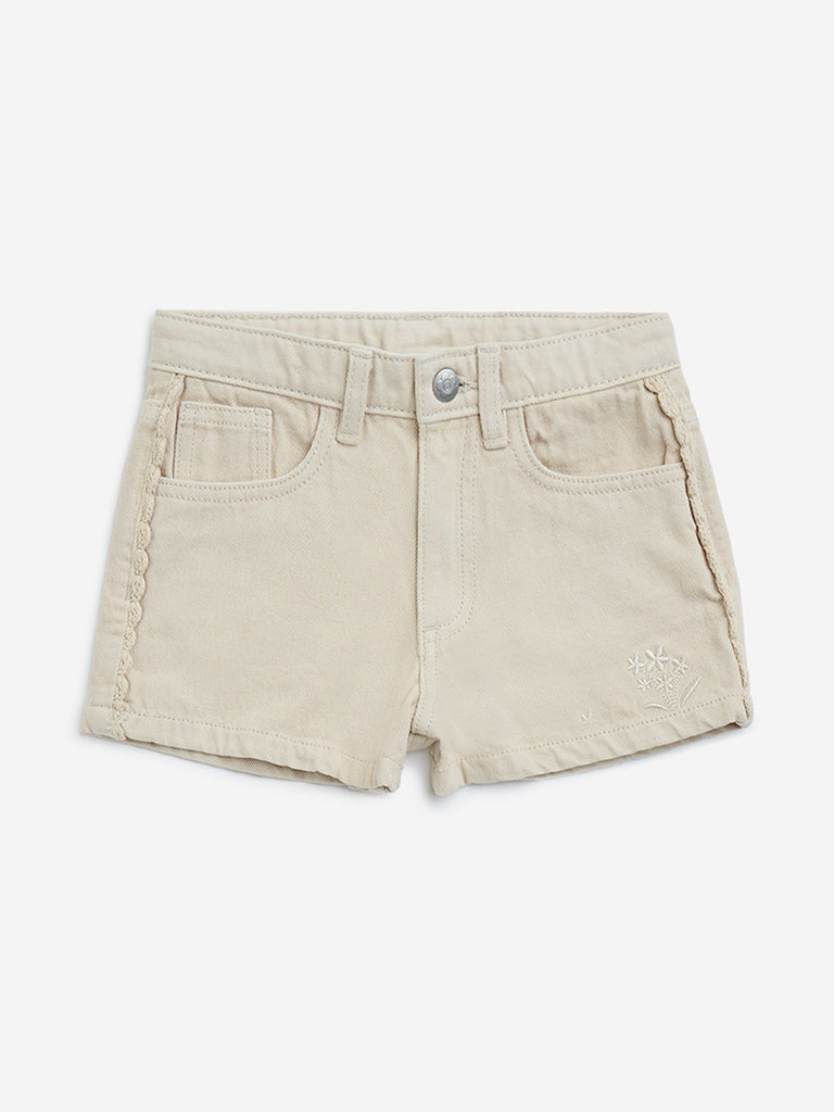 These beige denim shorts from HOP Kids boast subtle floral embroidery that adds a sweet charm. Made from pure cotton. they are fitted with a buttoned waistband. belt loops. a zipper placket. and multiple pockets for added utility.