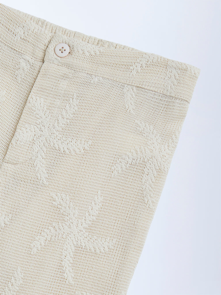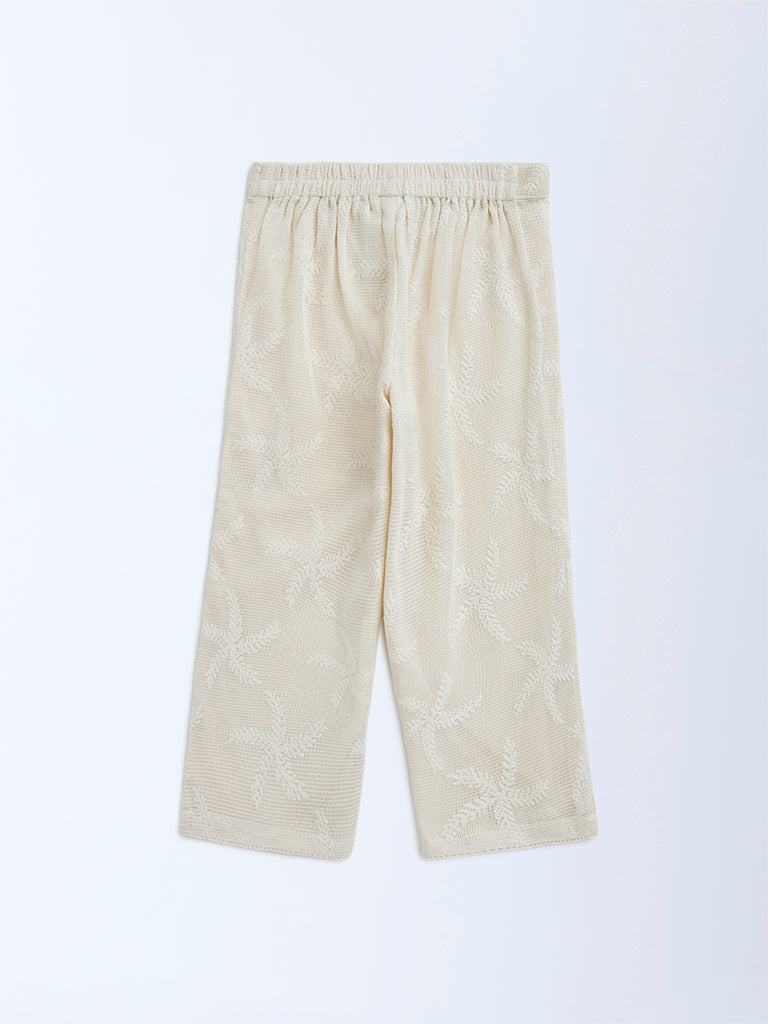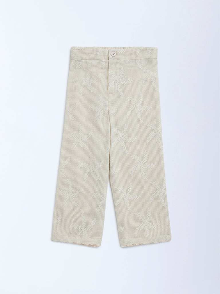 HOP Kids Beige Leaf Embroidered High-Rise Cotton-Blend Trousers