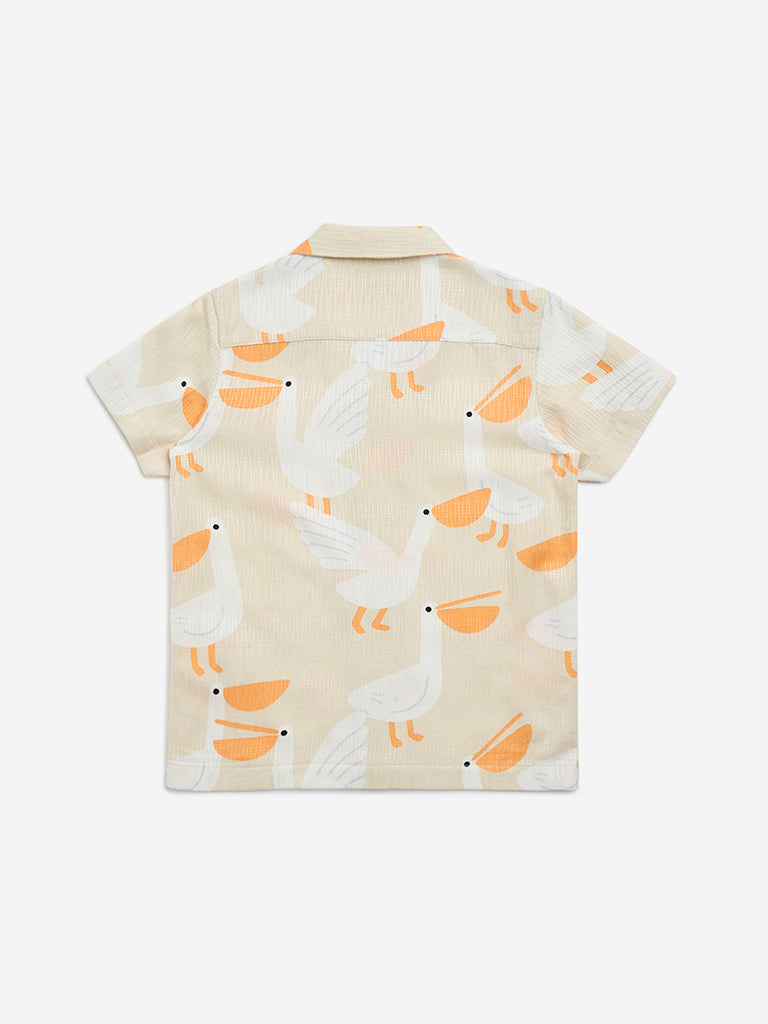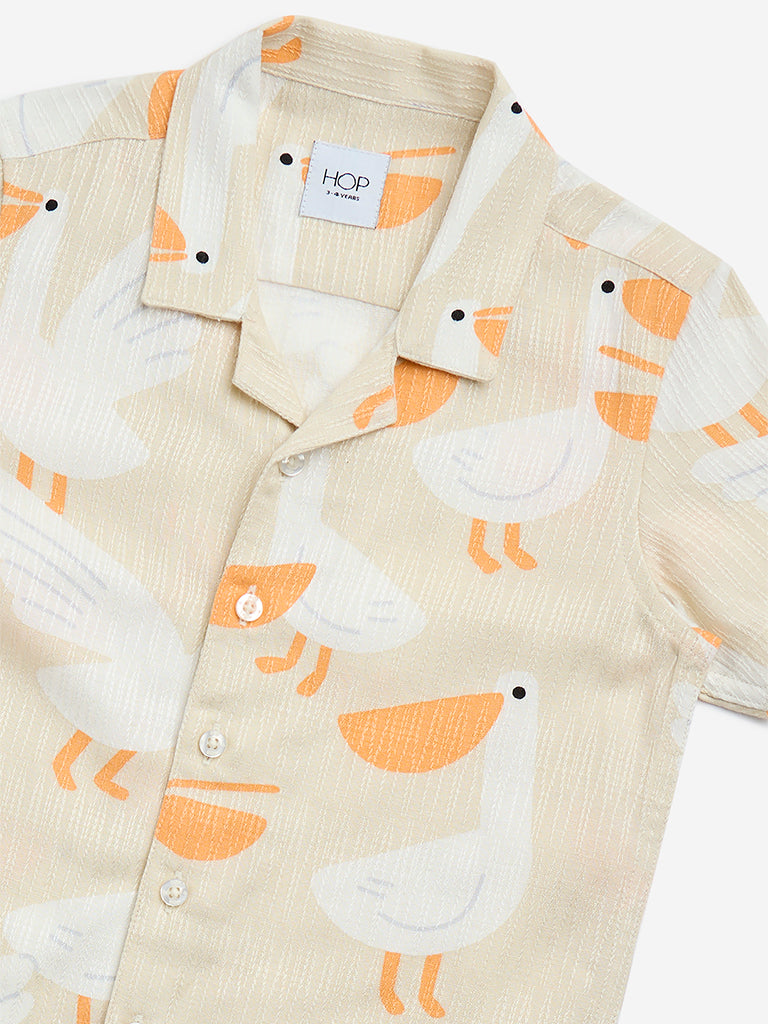 This beige shirt from HOP Kids showcases a playful pelican print in vibrant orange and white hues. Featuring a relaxed open collar and short sleeves. it is crafted from lightweight fabric for maximum comfort and style.