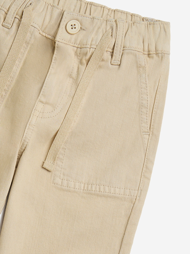 These beige jogger-style jeans from HOP Kids blend casual comfort with everyday utility. Constructed from a soft cotton-blend fabric. they feature an elasticated waistband with adjustable drawstrings for a flexible fit. Complete with multiple pockets. this versatile pair is perfect for everything from play dates to weekend outings.