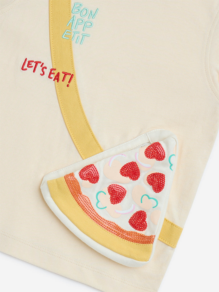 HOP Kids introduces this beige t-shirt in your little girls playtime edit. It includes a strap detail that leads to a pizza slice applique highlighting charming heart-shaped sequin embellishments. Designed with a round neck and short sleeves. this cotton-rich piece makes a fun pick for casual outings.