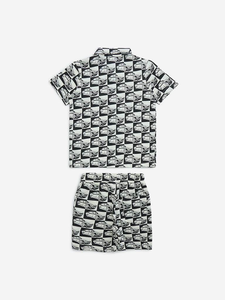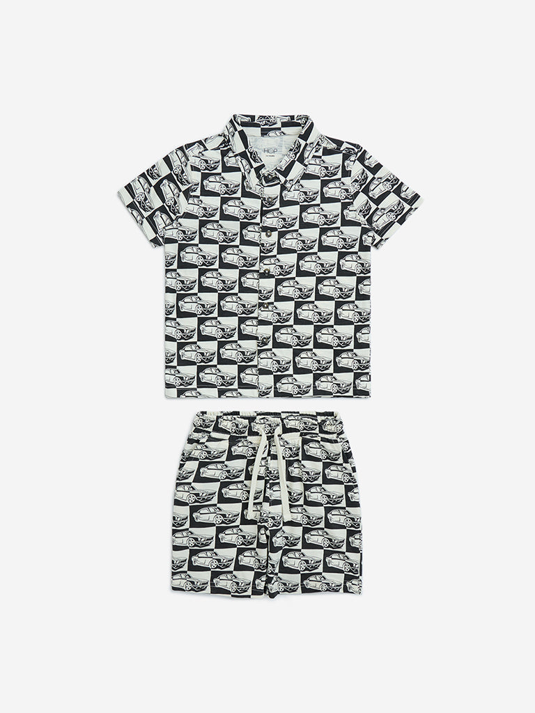 HOP Kids Black Car Printed Cotton Shirt and Shorts Set