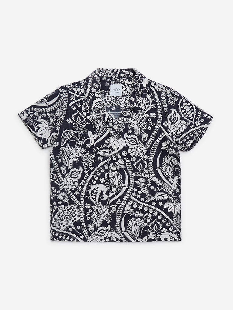 This black shirt from HOP Kids spotlights foliage prints throughout. Crafted from a breathable fabric for supreme comfort. it features a classic camp collar. a button-down front. and short sleeves.