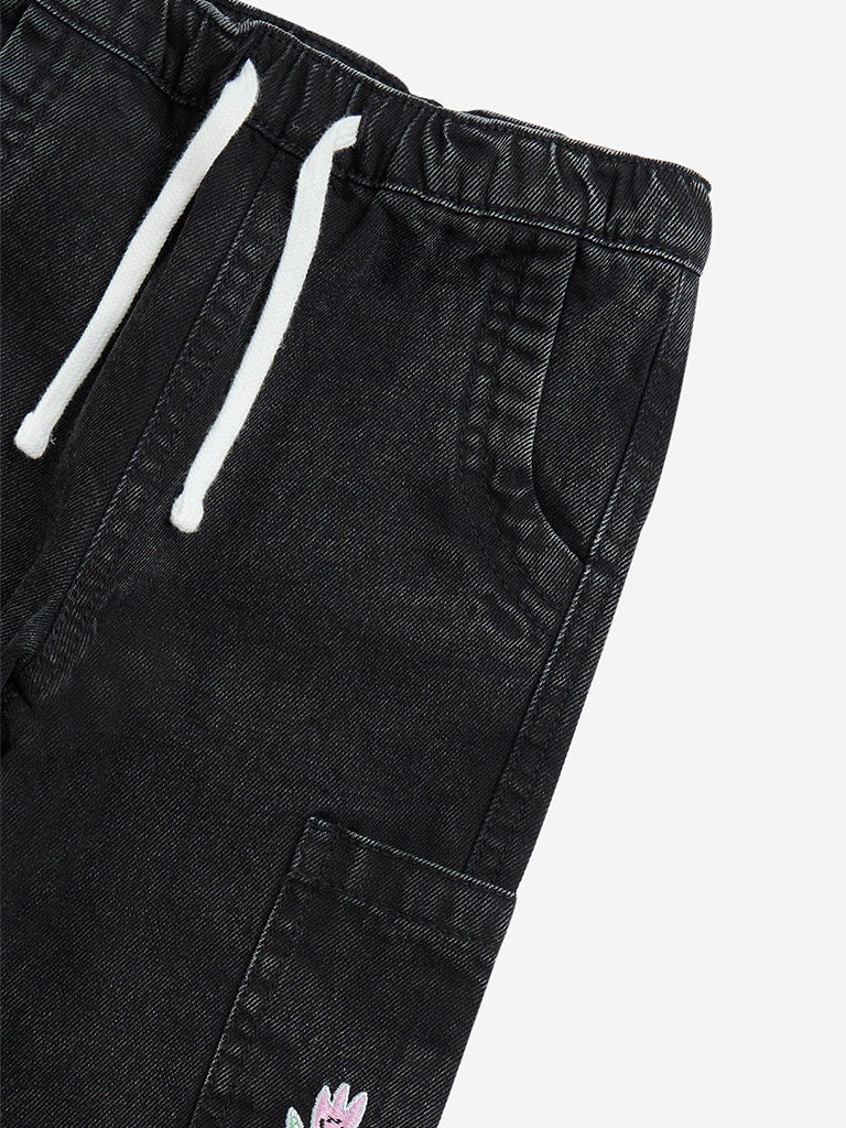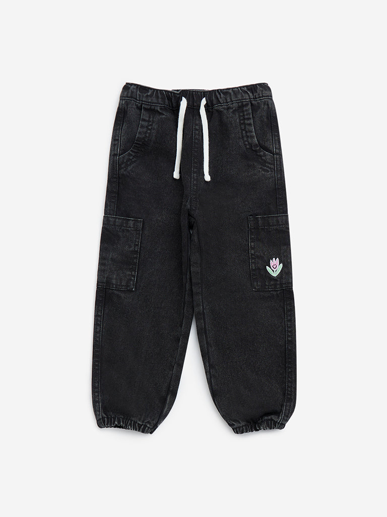These black cargo-style joggers from HOP Kids combine comfort and functionality. Featuring a mid-rise elasticated waistband with a drawstring. they include multiple pockets and playful embroidery for added charm.