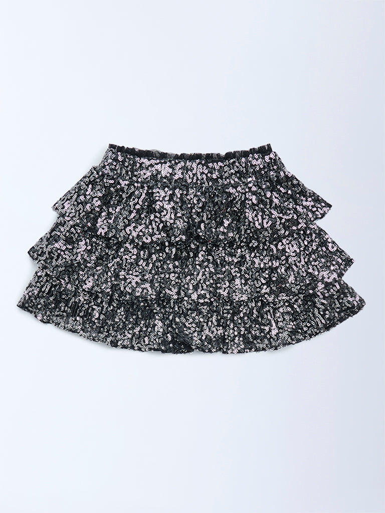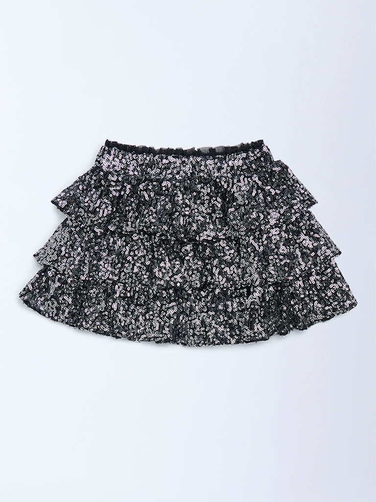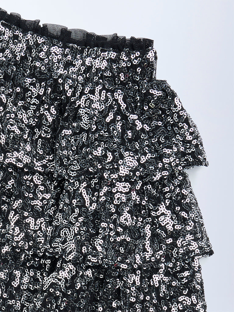 HOP Kids Black Sequin Embellished High-Rise Tiered Skirt