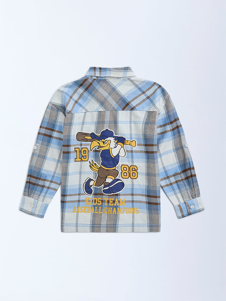 HOP Kids brings this blue shirt patterned with classic checks while the back is finished with a bold baseball-inspired graphic for playful appeal. Woven from breathable cotton. it is styled with a straight-point collar. button-up front and full sleeves. Twin flap pockets at the chest add a functional touch.