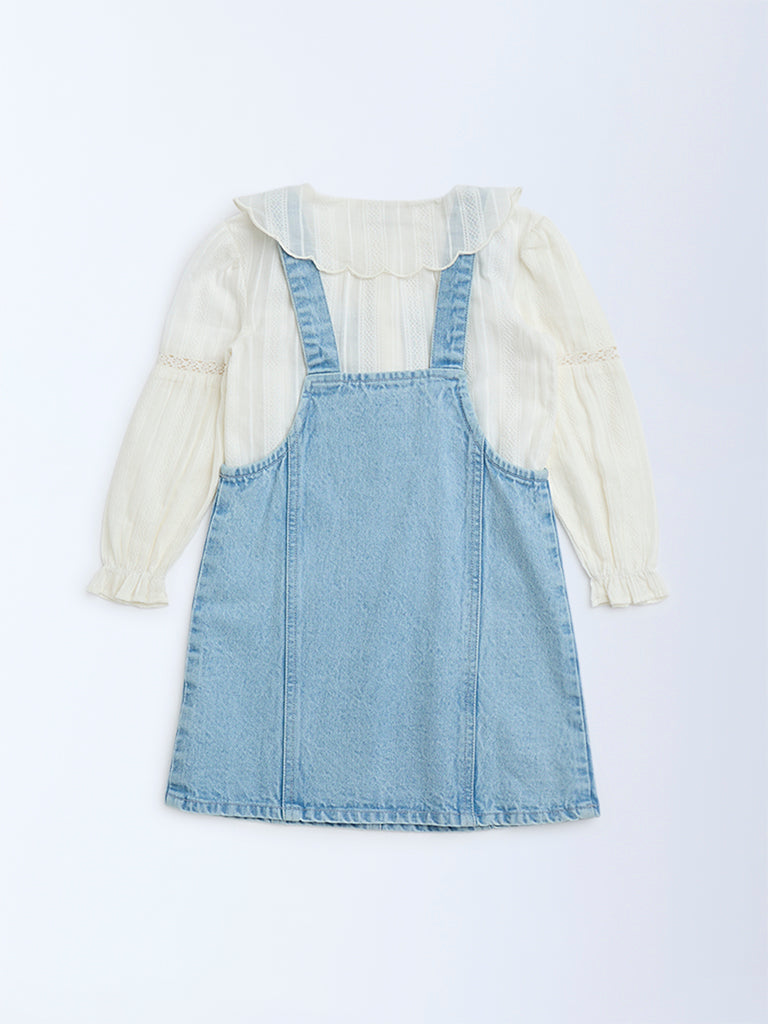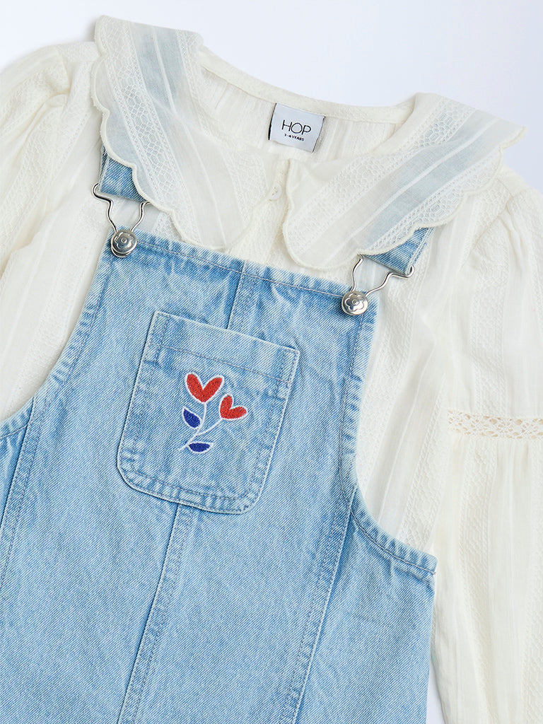 This blue pinafore set from HOP Kids brings together timeless details with everyday ease. The white top is fashioned with intricate embroidery. peasant sleeves. and a scalloped Peter Pan collar for a touch of vintage charm. Layered over it. the denim pinafore features floral embroidery atop a pocket and buttoned shoulder straps??making dressing simple and stylish.