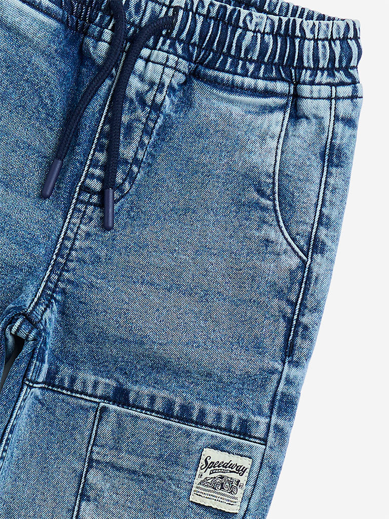 These blue jeans from HOP Kids are fitted with an elasticated drawstring waistband for a secure fit. Created from pure cotton. they’re designed for everyday ease and movement. Faded detailing at the front adds a touch of style. while multiple pockets offer practical storage.