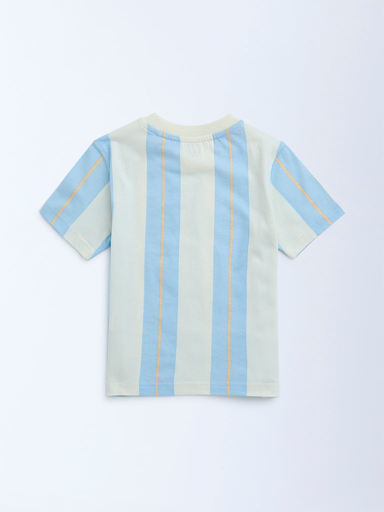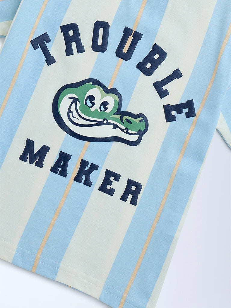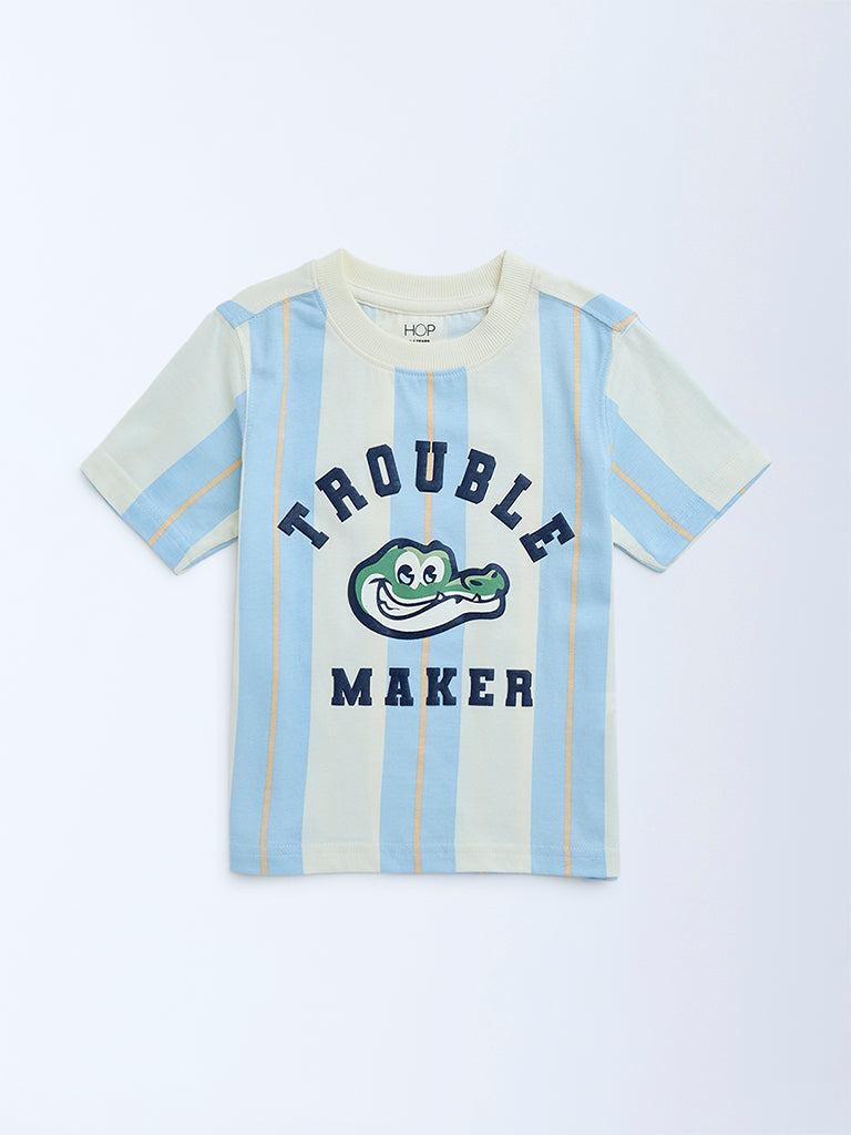 Made for playtime adventures big and small. this blue tee from HOP Kids is a fun staple for their casual line-up. Spun from pure cotton. it keeps them comfortable throughout the day. Vertical stripes add a stylish touch. while the bold graphic print on the front bring plenty of character. Finished with a crew neck and short sleeves. it’s the kind of everyday tee they’ll want to wear on repeat.
